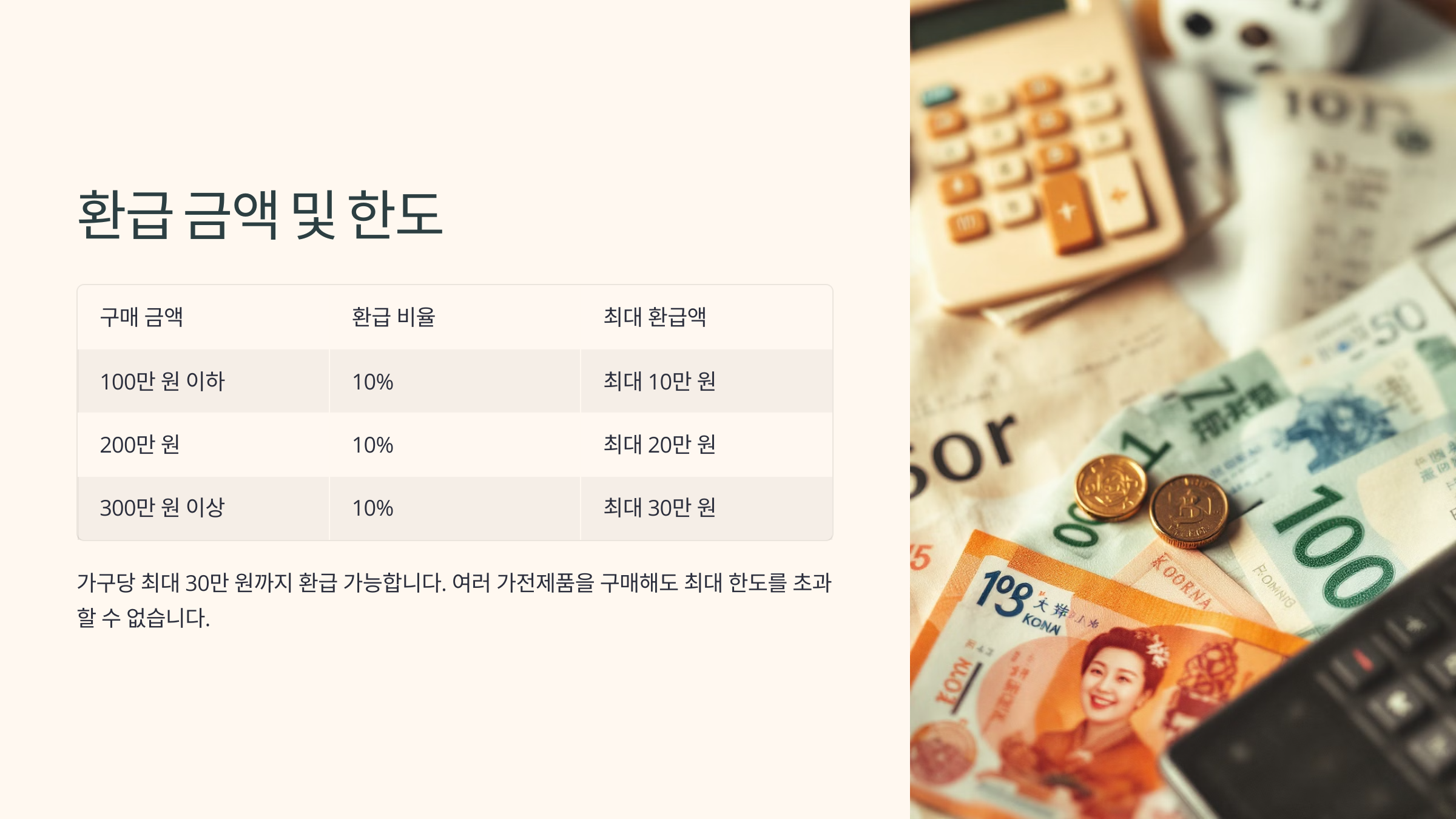 - ✔️ 여러 개의 가전제품을 구매해도 최대 한도 초과 시 추가 환급 불가