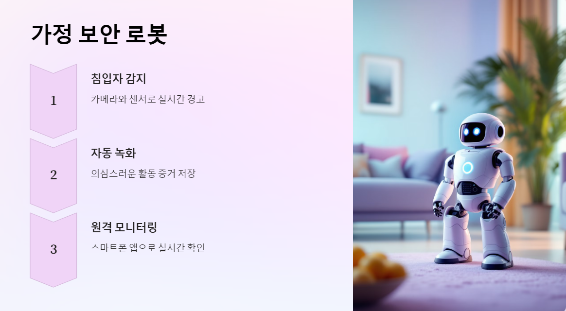이동형 보안 로봇은 집 안을 순찰하며 안전을 점검하는 기능을 수행합니다.