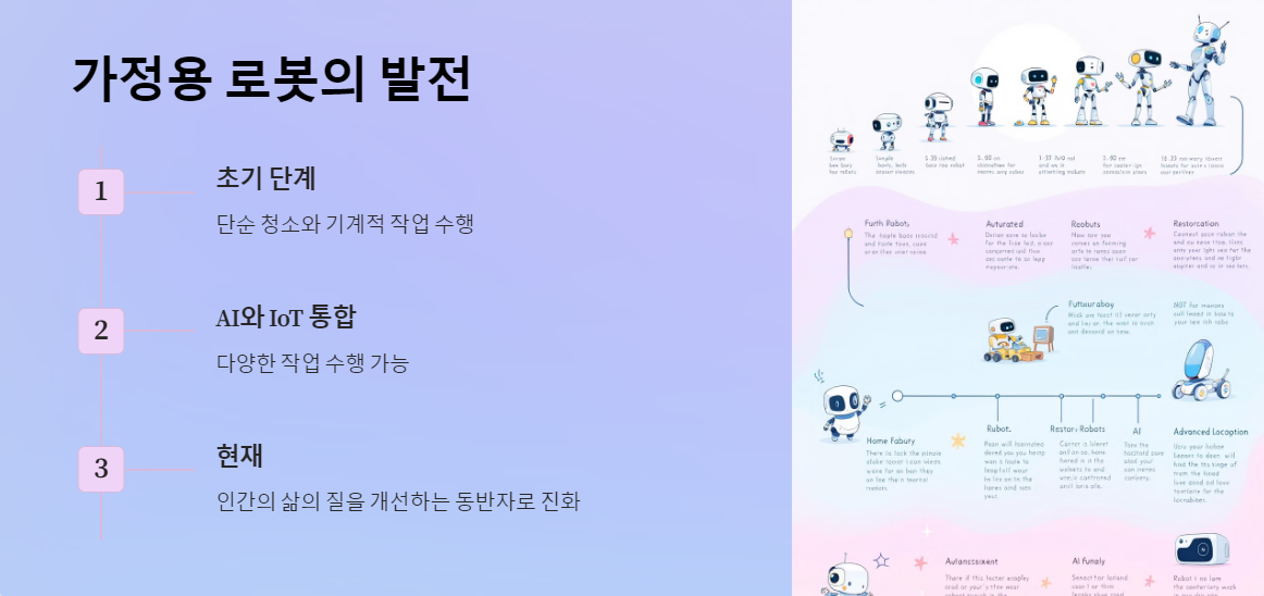 가정용 로봇은 처음에는 단순한 청소나 기계적 작업을 위해 개발되었지만, 현재는 인공지능(AI)과 사물인터넷(IoT) 기술의 발전 덕분에 훨씬 더 다양한 작업을 수행할 수 있게 되었습니다.