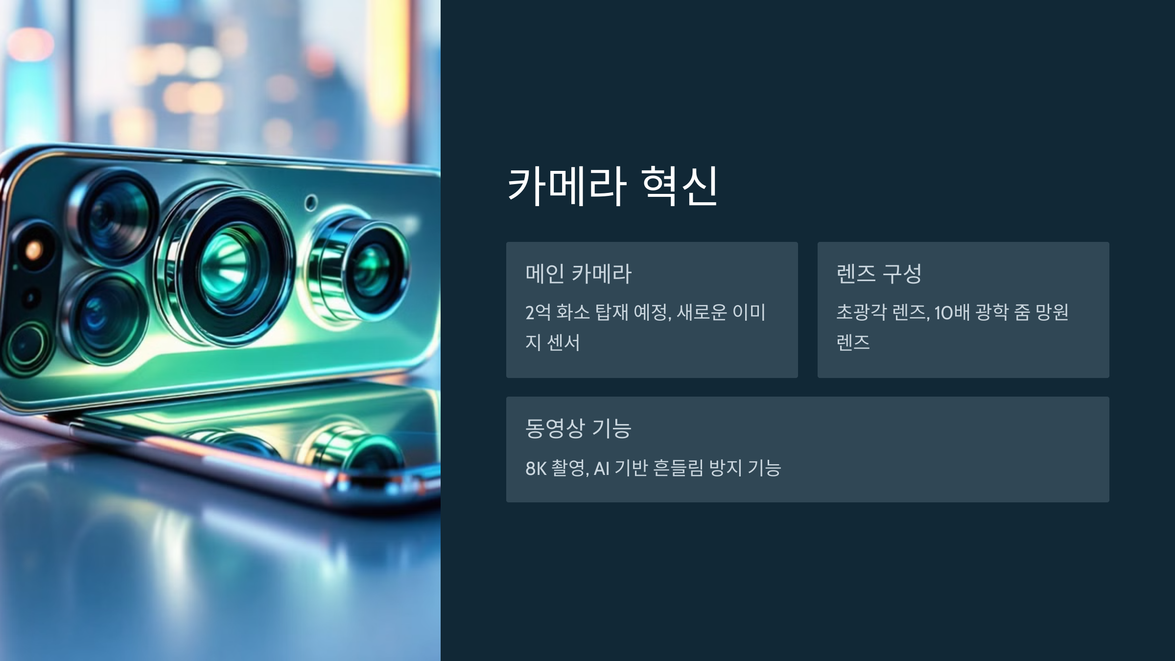 갤럭시 S25의 카메라는 한 차원 더 업그레이드될 예정이에요. 메인 카메라는 2억 화소를 탑재할 가능성이 높고, 새로운 이미지 센서를 통해 더욱 디테일하고 생생한 사진을 찍을 수 있을 거예요.