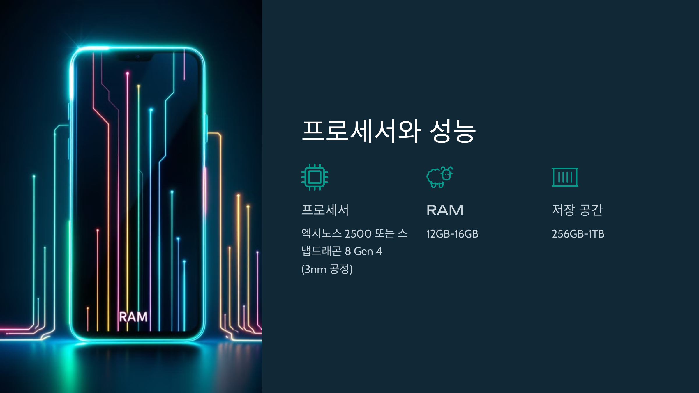 갤럭시 S25는 최신 엑시노스 2500 칩셋과 퀄컴 스냅드래곤 8 Gen 4를 지역별로 나눠 탑재할 가능성이 커요. 두 프로세서는 모두 3nm 공정을 기반으로 제작되어, 기존 모델보다 뛰어난 속도와 전력 효율성을 자랑해요.
