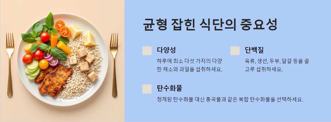 균형 잡힌 식단은 면역 체계를 강화하고 만성질환 예방에도 도움을 줍니다.