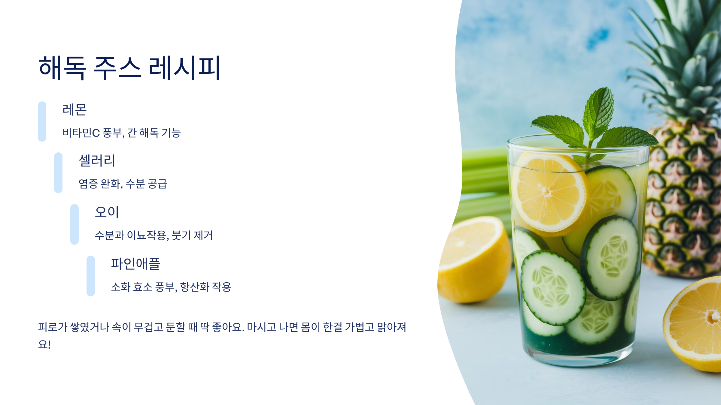 디톡스 효과를 위해선 항산화 물질, 수분이 풍부한 재료, 해독 작용을 돕는 채소가 핵심이에요. 마시고 나면 몸이 가볍고 속이 깨끗해지는 느낌!