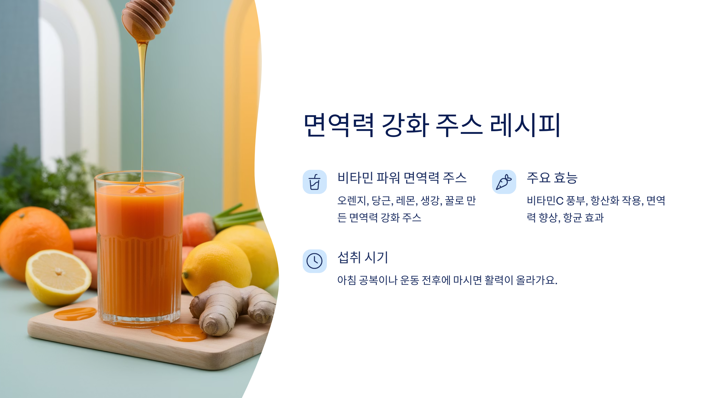 면역력 주스는 계절 변화나 피곤할 때, 감기 예방, 에너지 충전용으로 정말 효과가 좋아요. 비타민C, 항산화 성분, 면역세포 활성화를 돕는 재료들로 구성하면 딱이에요.