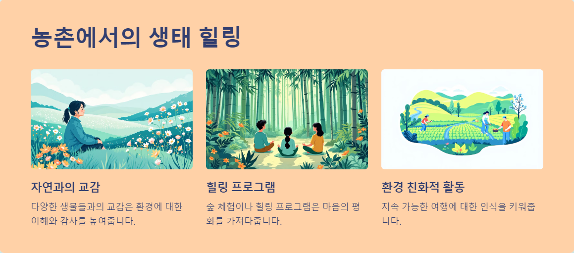 농촌은 자연 속에서 생태 힐링을 경험하기에 최적의 장소입니다.