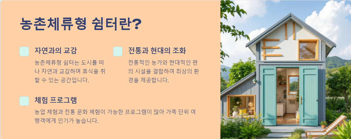 도시의 바쁜 일상에서 벗어나고 싶은가요? 농촌체류형 쉼터는 자연 속에서의 힐링과 특별한 경험을 선사하는 매력적인 여행 방식입니다. 깨끗한 공기, 따뜻한 사람들, 그리고 건강한 음식이 기다리고 있는 이 여행은, 몸과 마음 모두를 충전해줄 것입니다.