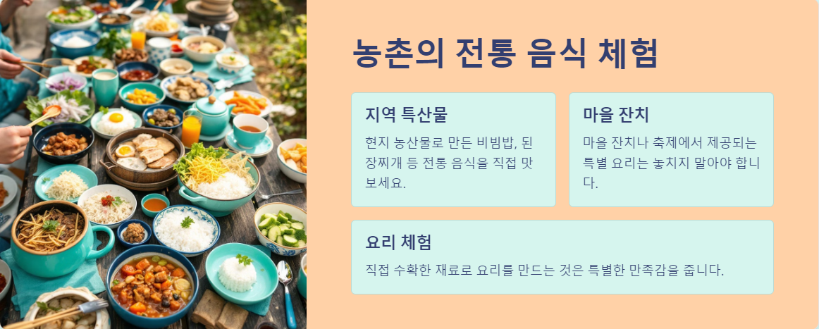 농촌 음식 체험은 여행의 특별한 추억으로 남게 될 것입니다.