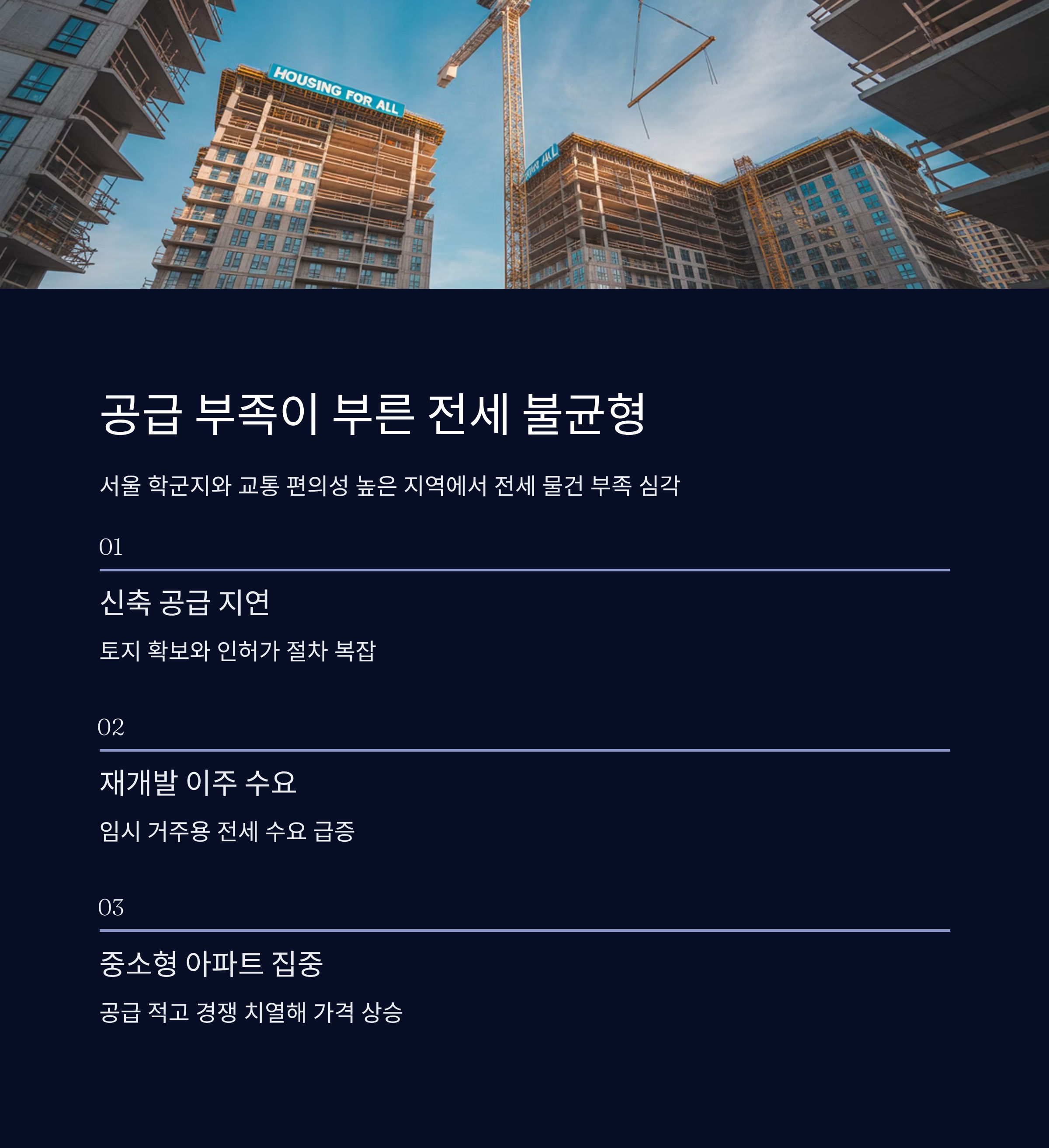 정부나 지방자치단체에서 신축 아파트를 짓는 데는 시간이 오래 걸리고, 토지 확보와 인허가 절차 또한 복잡해요. 이런 환경 속에서 신축 주택 공급은 한정적일 수밖에 없고, 수요는 계속 늘어나니 전세가격이 자연스럽게 치솟는 거죠.