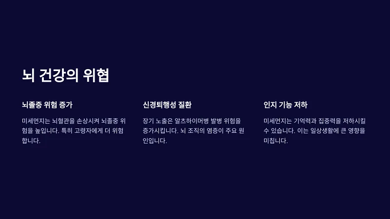미세먼지는 뇌 건강에도 악영향을 미칠 수 있습니다. 최근 연구에 따르면 미세먼지에 지속적으로 노출된 사람들은 알츠하이머병, 파킨슨병 등의 신경퇴행성 질환의 발병 위험이 증가하는 것으로 나타났습니다. 미세먼지에 포함된 물질이 뇌로 이동하여 염증을 유발하고, 뇌세포의 기능을 손상시키기 때문입니다.