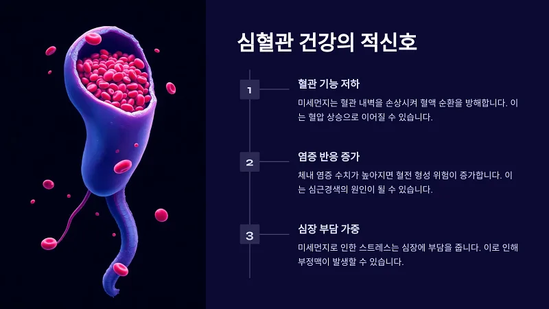 미세먼지는 심혈관 건강에도 부정적인 영향을 미칠 수 있습니다. 미세먼지에 포함된 독성 물질은 혈관 기능을 저하시키고 염증 반응을 촉진시킬 수 있습니다. 이로 인해 심근경색, 협심증, 부정맥 등의 심혈관 질환 발생 위험이 높아질 수 있습니다. 또한, 연구에 따르면 미세먼지가 심장과 뇌의 혈류에 부정적인 영향을 미쳐 뇌졸중과 같은 뇌혈관 질환의 위험을 증가시킬 수 있다는 결과도 있습니다.
