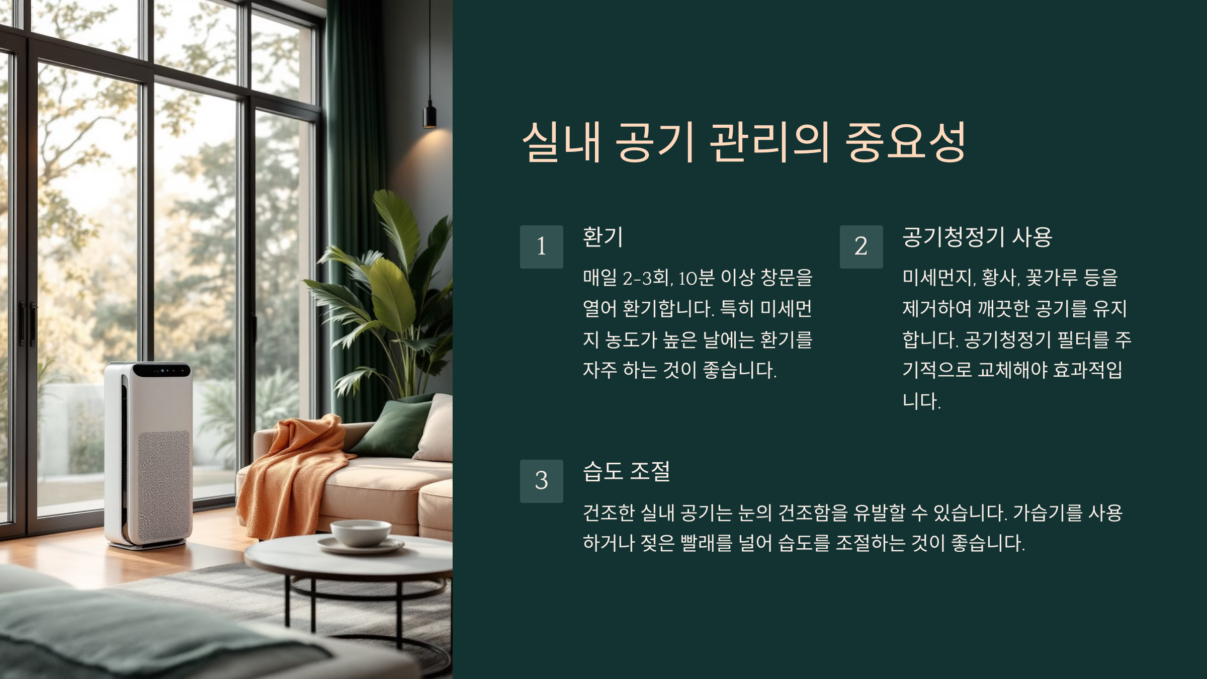 창문을 열어 환기하는 것도 필요한데, 이때 미세먼지 농도를 확인하고 농도가 낮은 시간대를 선택하는 것이 좋아요. 이렇게 실내 공기 관리를 철저히 하면 눈 건강은 물론, 전반적인 건강도 지킬 수 있답니다.