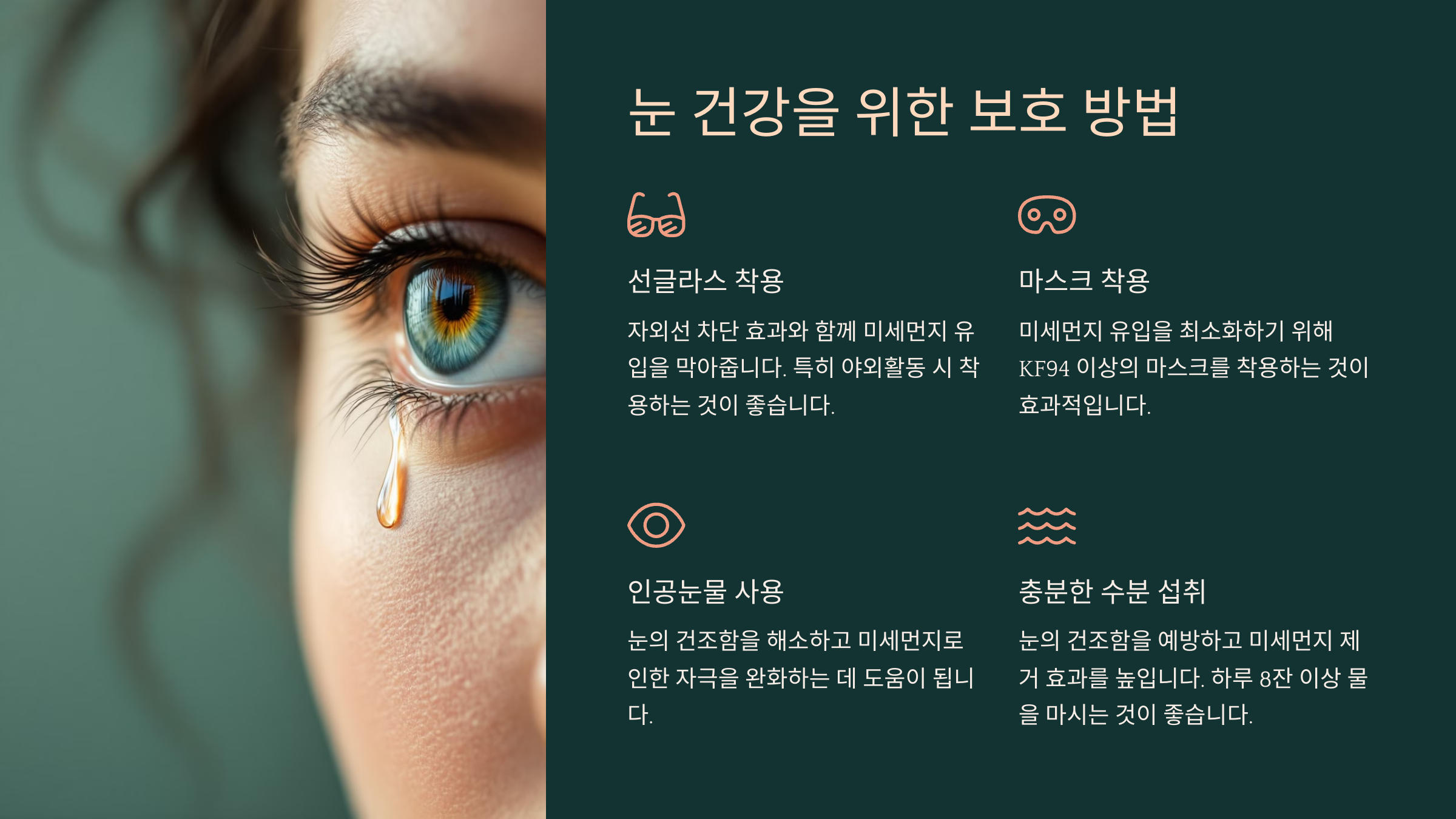눈 건강을 지키기 위해서는 생활 습관도 중요한 역할을 해요. 미세먼지가 심한 날에는 되도록 외출을 자제하고, 꼭 나가야 할 경우에는 선글라스와 마스크를 착용하는 것이 좋아요. 외출 후에는 반드시 손과 얼굴을 깨끗이 씻어주세요.