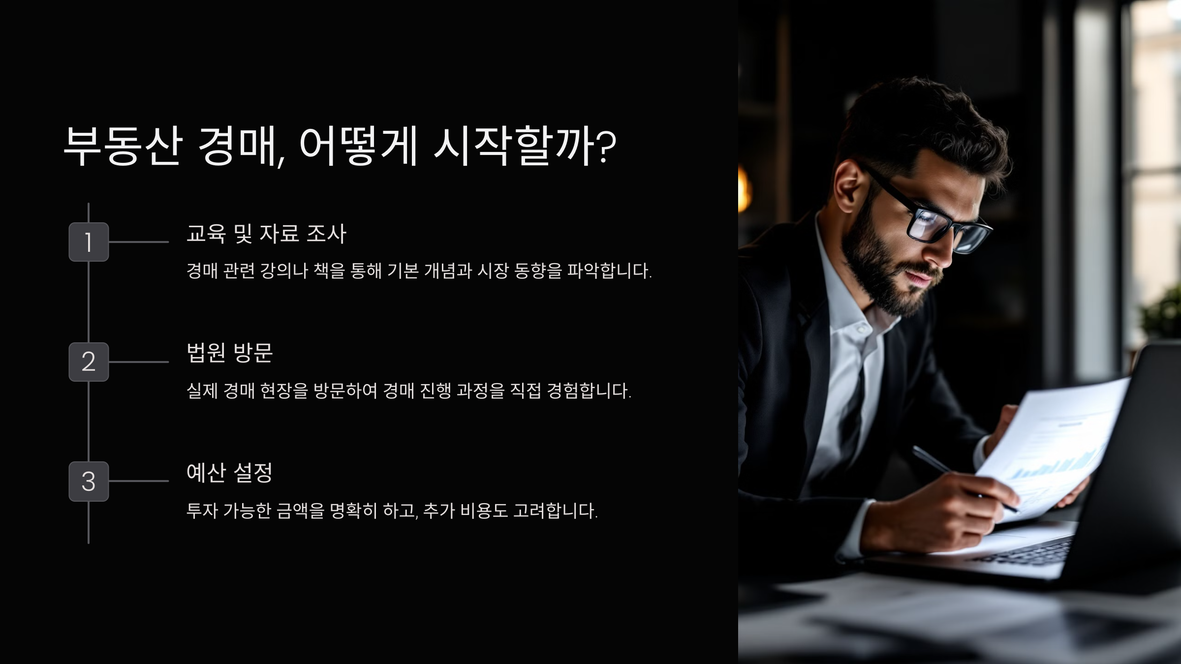 1. 교육 및 자료 조사: 경매 관련 강의나 책을 통해 기본 개념과 시장 동향을 파악하는 것이 첫걸음이에요. 인터넷에도 다양한 무료 자료와 강의가 있으니 활용해 보세요.