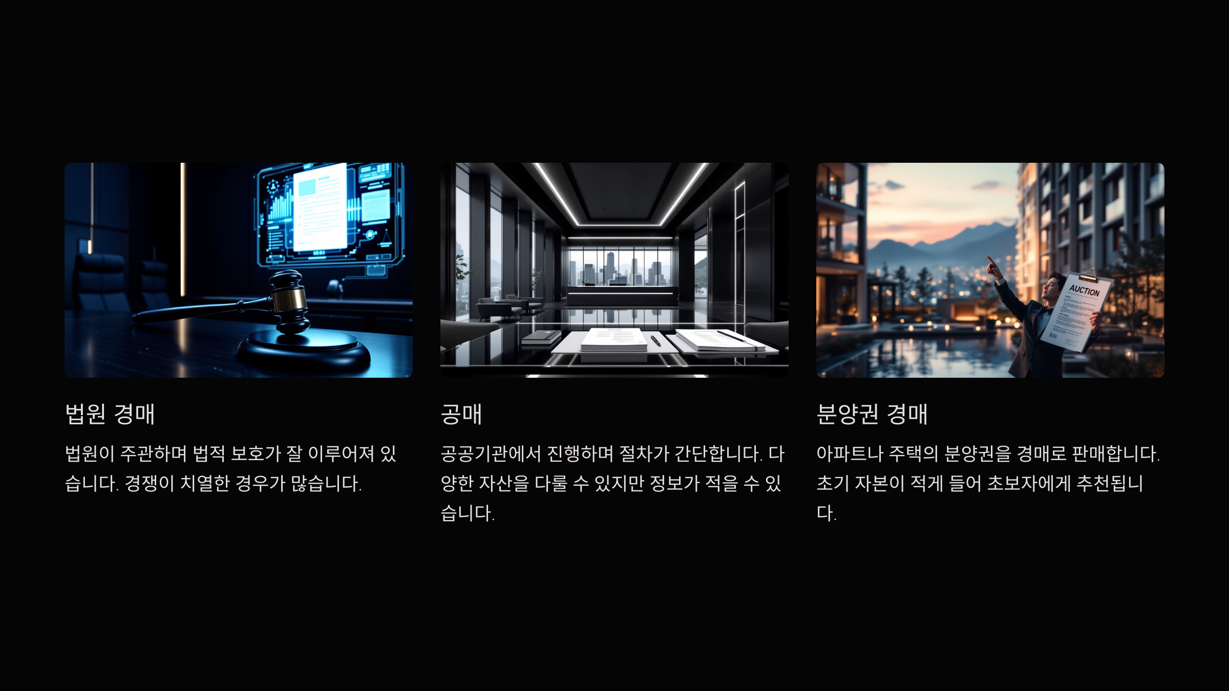 법원 경매: 채무자가 빚을 갚지 못했을 때 법원이 주관하여 부동산을 처분하는 방식이에요. 법적인 보호가 잘 이루어져 있어 안정적이지만, 경쟁이 치열한 경우가 많아요.