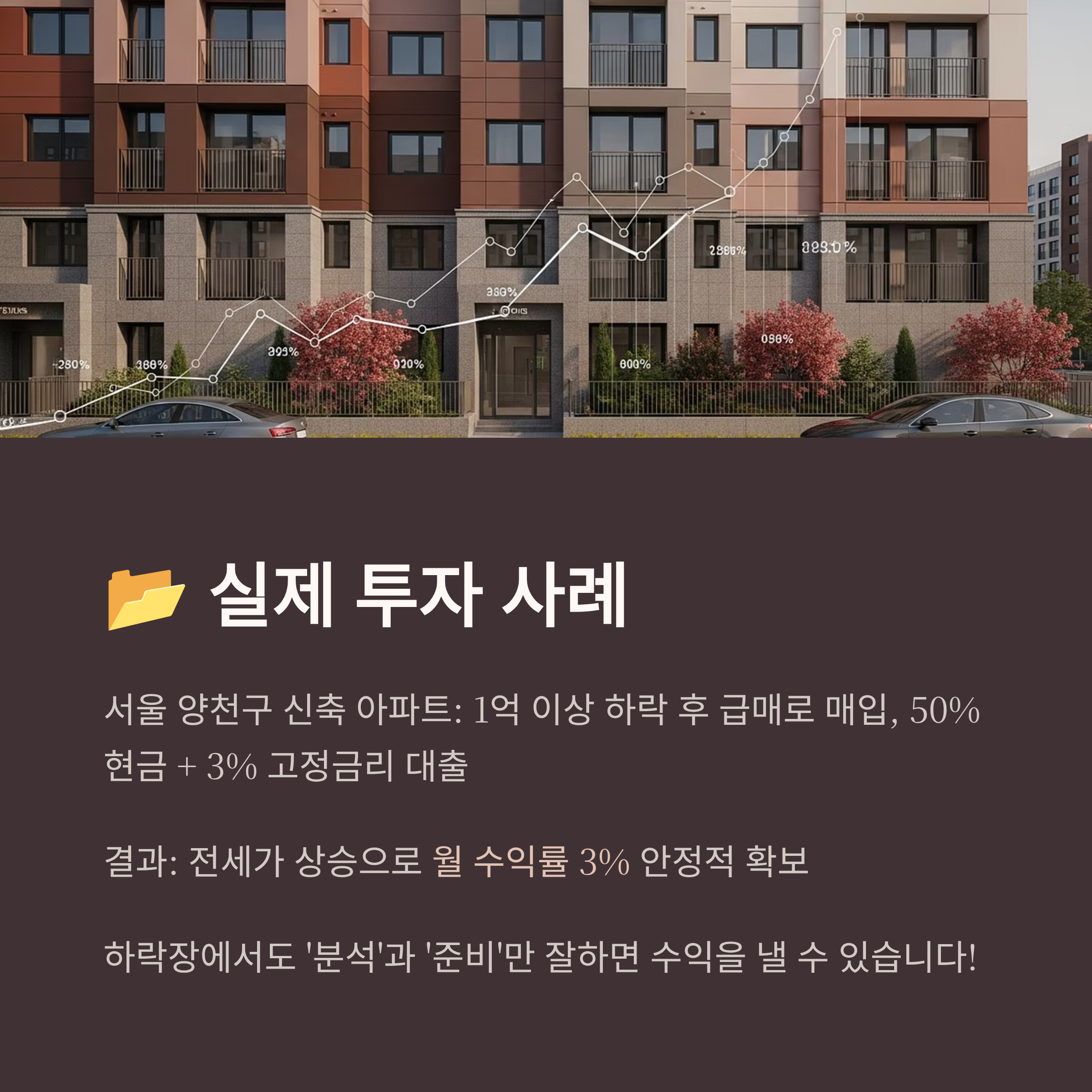 2025년 상반기 들어 전세가가 오르면서 이 아파트 전세를 놓았고, 매입가 대비 월 수익률 3%를 안정적으로 확보하고 있어요. 초기 하락장에 진입해 안정적 수익을 실현한 좋은 사례예요.