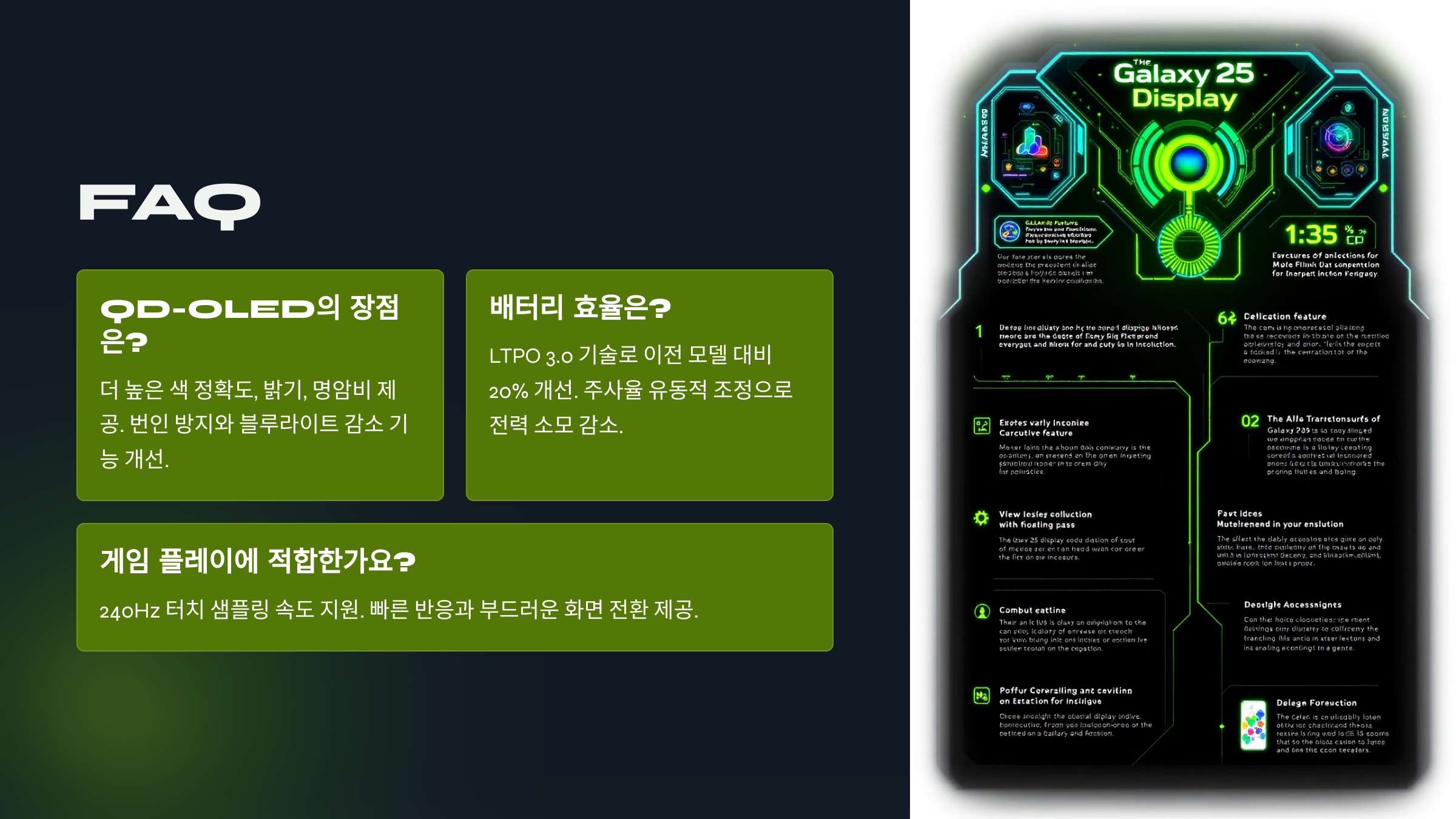 A1. 갤럭시 25는 QD-OLED 기술을 사용해 기존 OLED보다 더 높은 색 정확도, 밝기, 명암비를 제공합니다. 또한 번인 방지와 블루라이트 감소 기능도 대폭 개선되었어요.