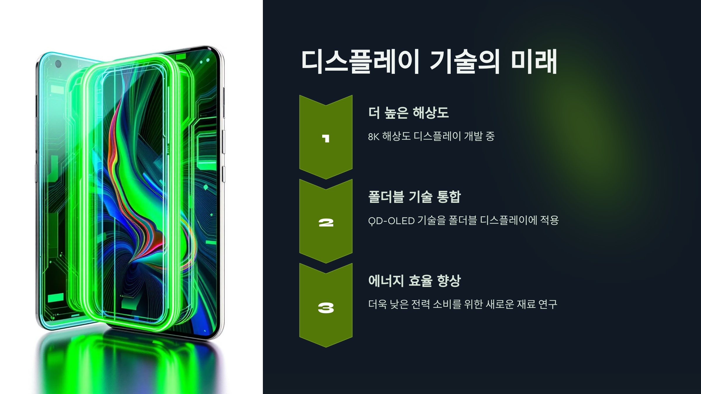 OLED는 오래전부터 스마트폰 디스플레이 기술의 표준이 되어왔지만, 갤럭시 25에서는 이 기술을 한 단계 더 발전시킨 QD-OLED를 도입했어요. 퀀텀닷(Quantum Dot) 기술은 색 정확도를 크게 높여 기존 OLED에서 발생하던 색 번짐과 퇴색 문제를 거의 완벽히 제거했답니다.