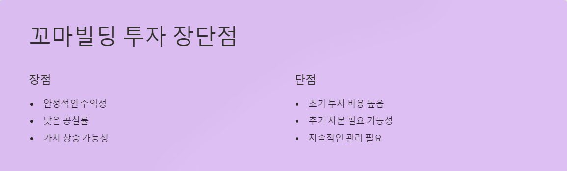 꼬마빌딩의 가장 큰 장점 중 하나는 초기 투자 비용이 중형 또는 대형 건물에 비해 훨씬 낮다는 점입니다. 이로 인해 중소 규모의 투자자도 시장 진입이 용이하며, 대출 활용 또한 비교적 수월하게 가능합니다. - 안정적인 임대 수익