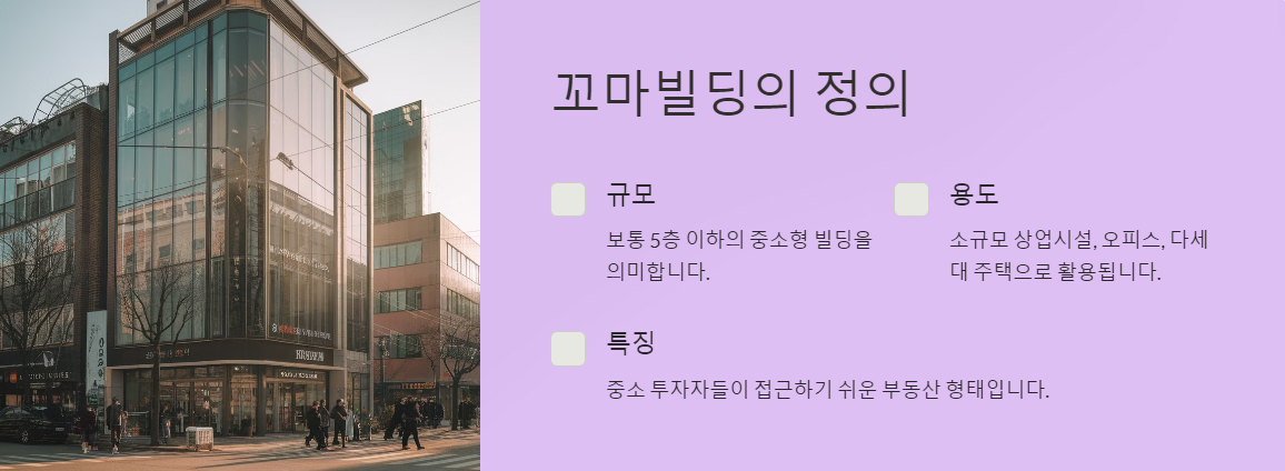 꼬마빌딩은 일반적으로 5층 이하의 중소형 건물을 지칭합니다. 이 건물들은 주로 소규모 상업시설, 오피스 공간, 또는 다세대 주택으로 활용되며, 소유주의 투자 목적에 따라 다양하게 운영될 수 있습니다. 건물의 크기와 가격이 비교적 낮아 부동산 투자 경험이 많지 않은 이들도 쉽게 접근할 수 있는 특징을 가집니다.