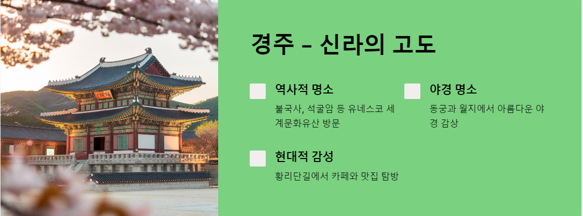 경주는 신라 천년의 역사를 간직한 도시로, 불국사, 석굴암 등 유네스코 세계문화유산이 자리 잡고 있습니다.