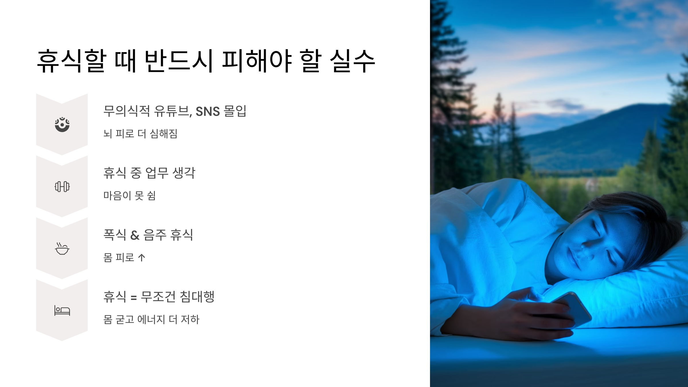 휴식기술을 잘 활용하기 위해서 오히려 '하지 말아야 할 것들'을 아는 게 더 중요해요. 이걸 피해야 진짜 제대로 쉰다고 할 수 있어요.