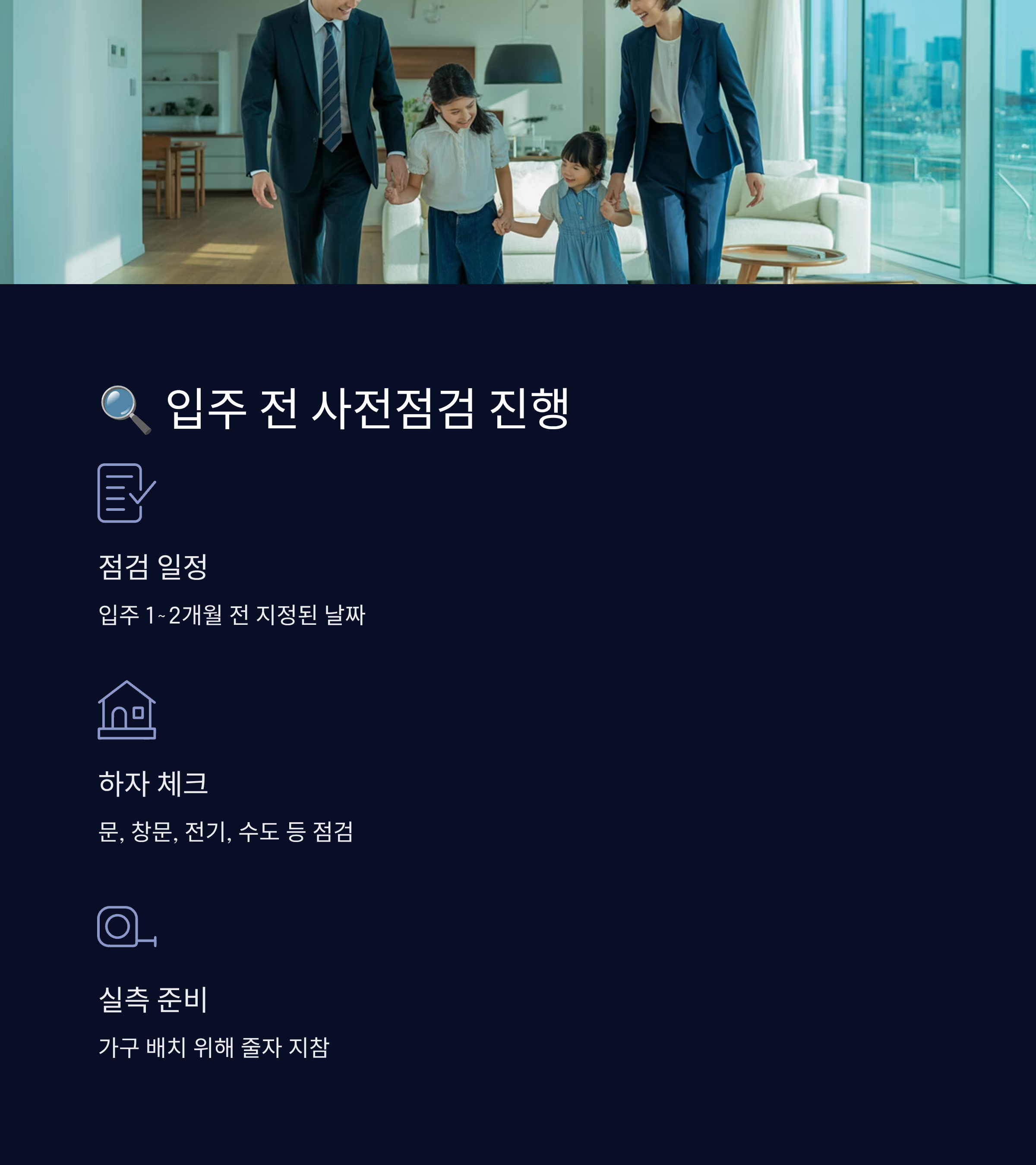 사전점검은 보통 입주 약 1~2개월 전에 지정된 일정에 따라 이뤄지며, 각 동·호수별로 날짜와 시간이 정해져요. 이때는 가족 모두가 함께 방문해 공간을 미리 느껴보는 것도 추천드려요.