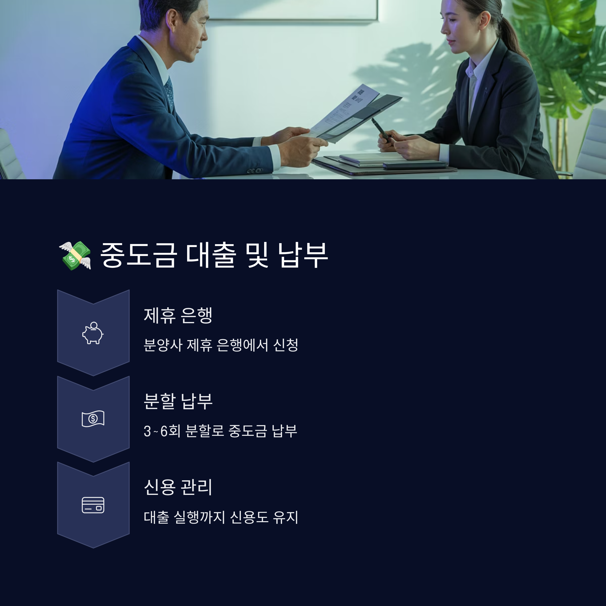 중도금 대출을 이용하기 위해선 개인 신용도, 소득, 기존 대출 여부 등을 확인받아야 해요. 따라서 대출 실행 전까지 신용관리를 철저히 해야 하고, 대출 실행 불가 판정을 받지 않도록 주의가 필요해요. ⚠️