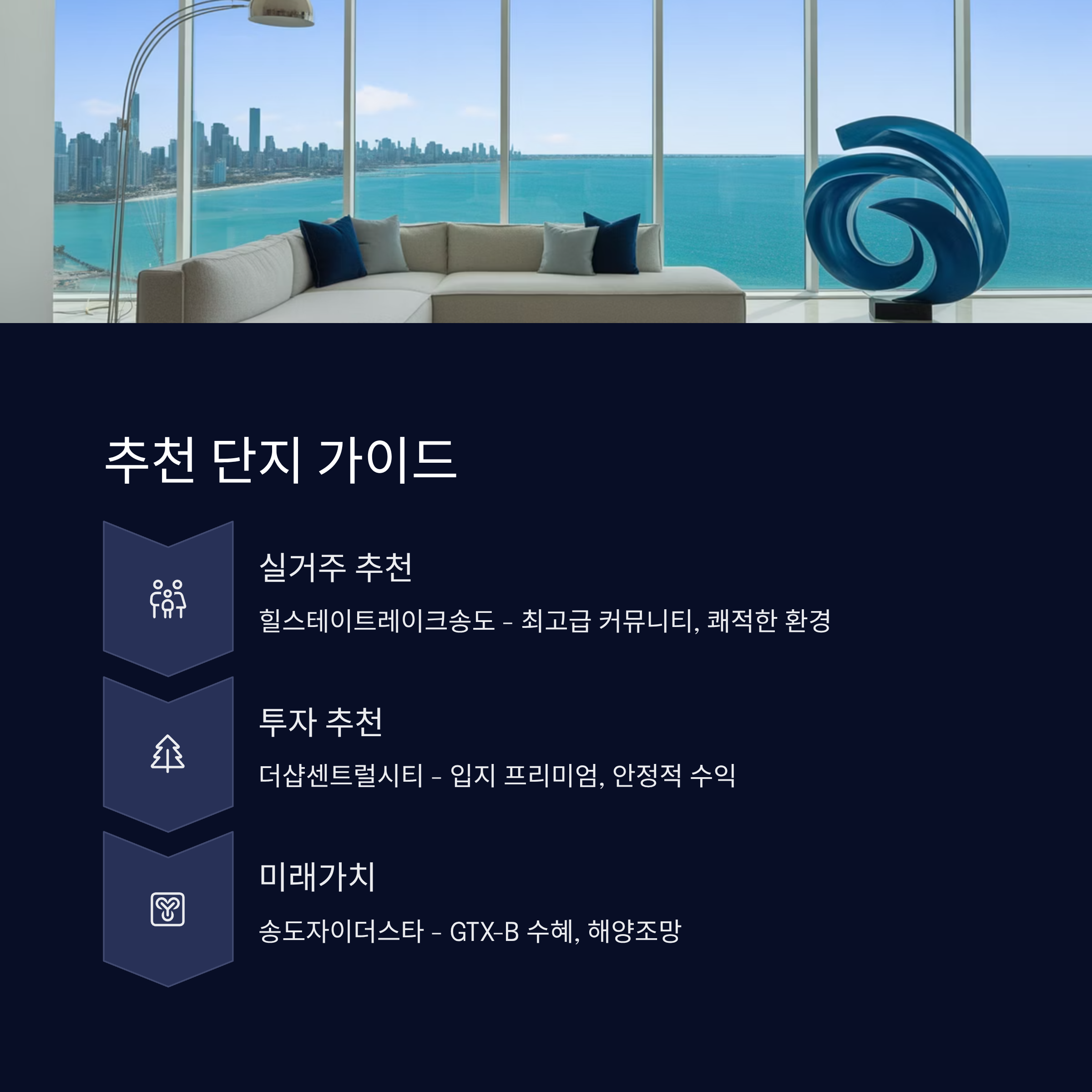 | 송도자이더스타 | 투자/실거주 겸용 | 미래 교통 호재 | GTX 개통 수혜 예상 |