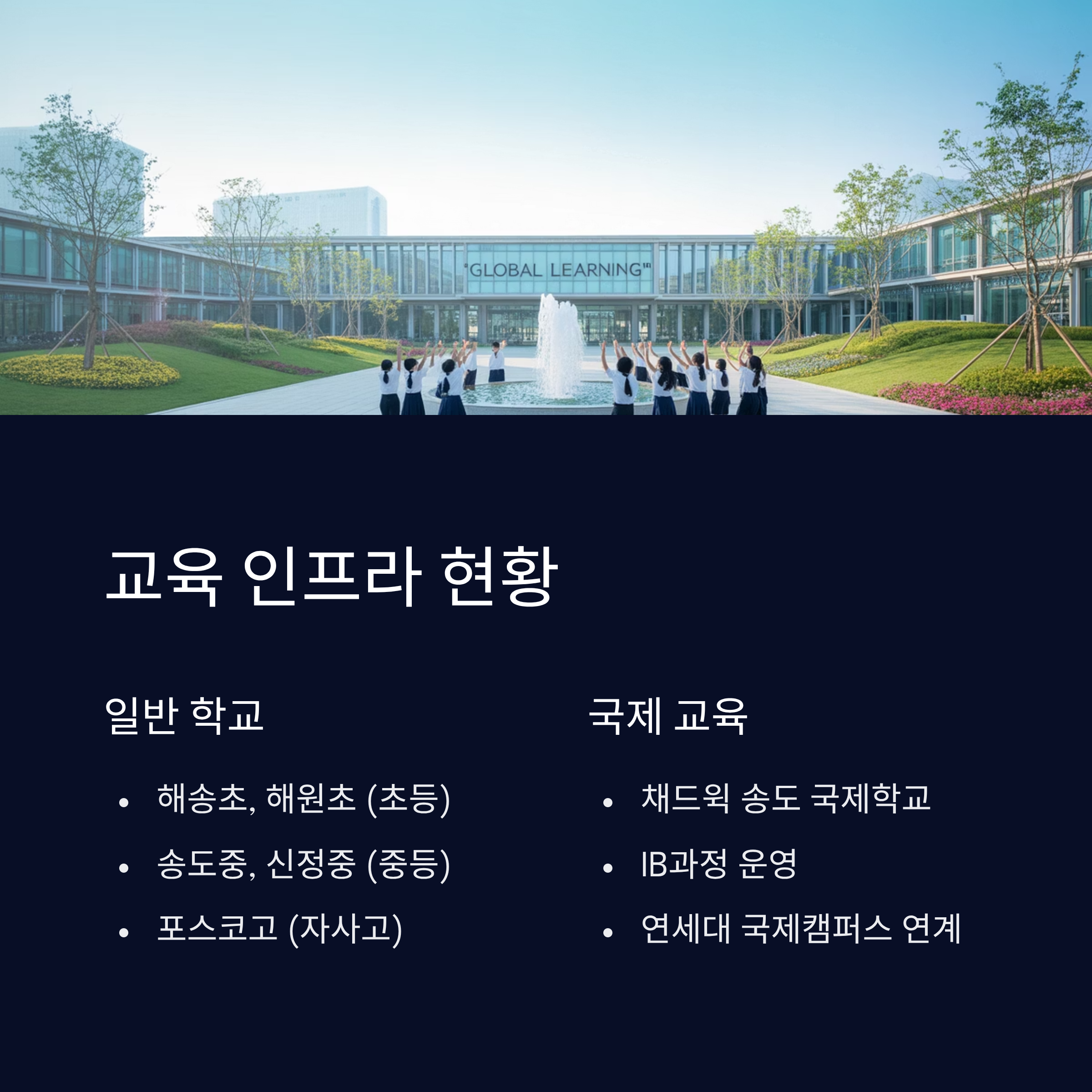 송도의 교육 인프라는 계속해서 확장 중이에요. 단지 선택 시에는 인근 학군이 어떤지 반드시 확인해야 해요. 특히 초등학교 통학 거리는 실거주 만족도에 큰 영향을 미쳐요 👨👩👧👦