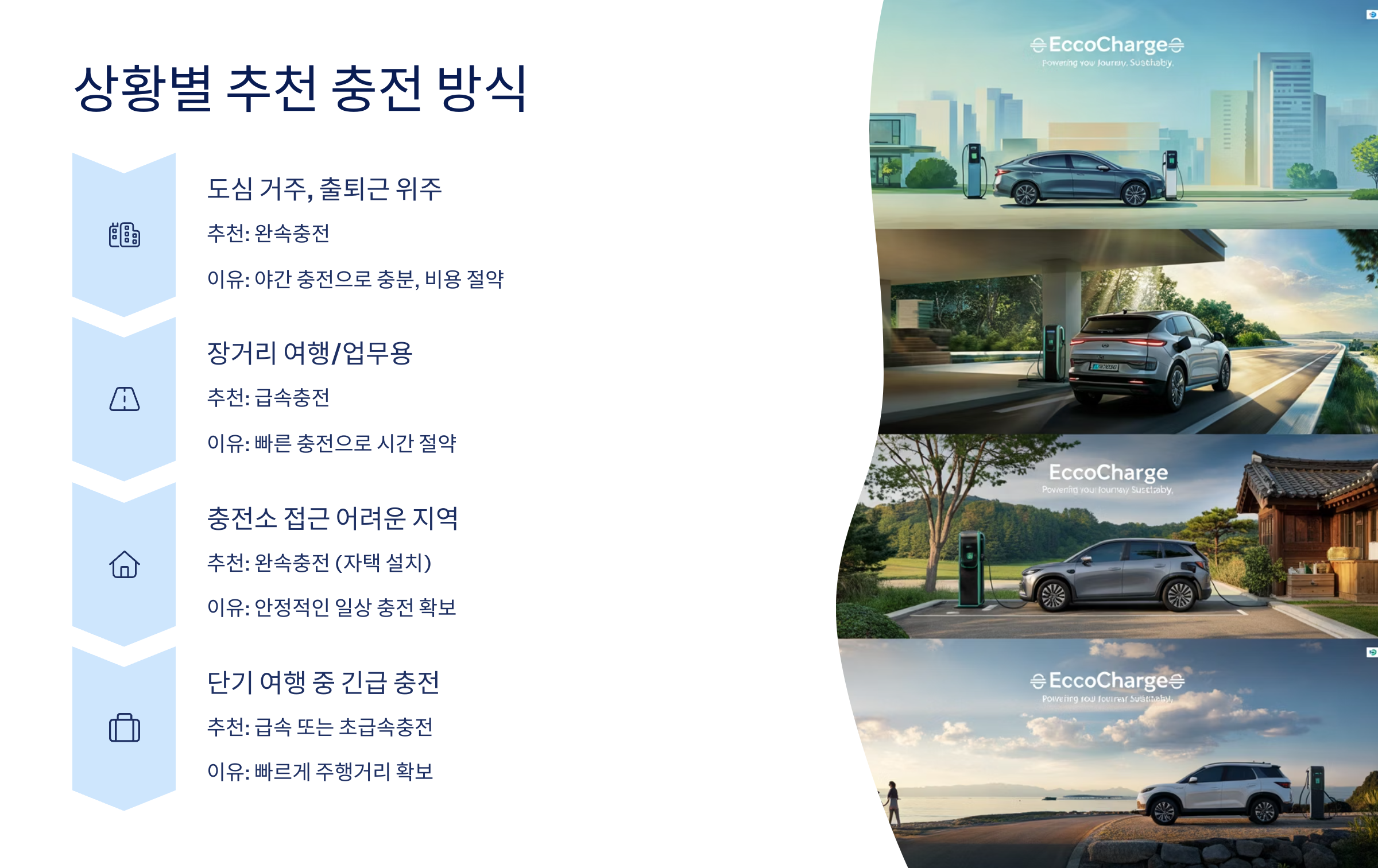 | 단기 여행 중 긴급 충전 | 급속 또는 초급속충전 | 빠르게 주행거리 확보 |