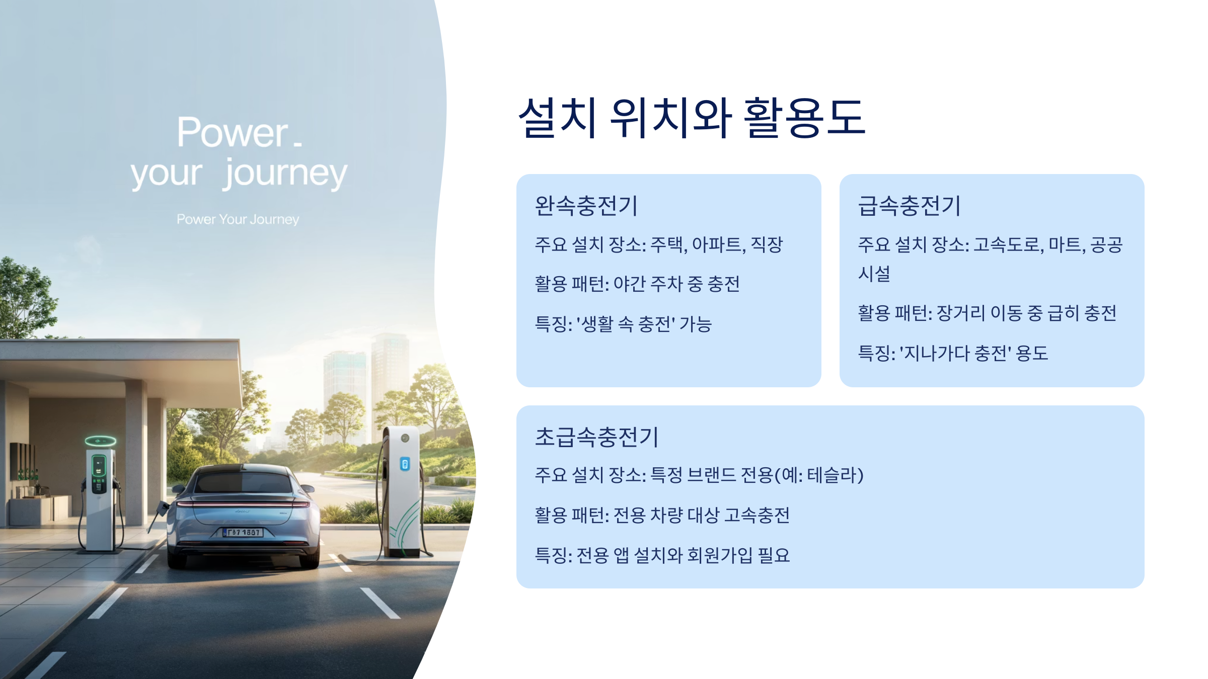 | 완속충전기 | 주택, 아파트, 직장 | 야간 주차 중 충전 |