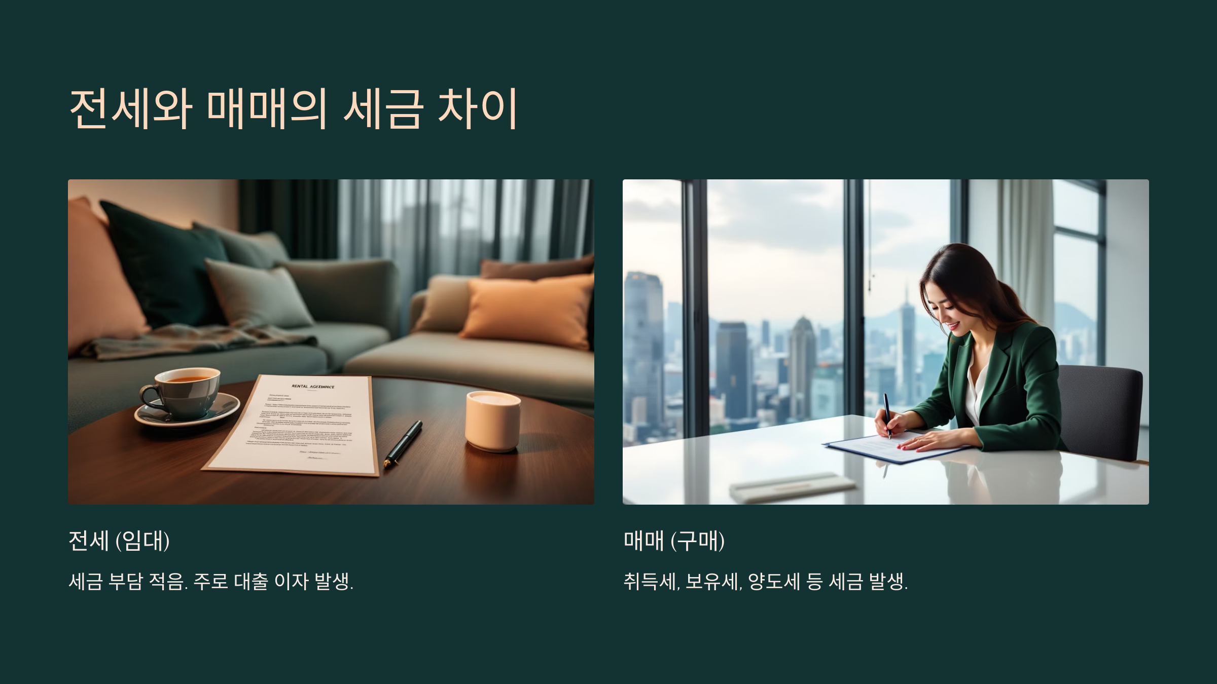 전세와 매매는 단순히 거주 방식의 차이뿐만 아니라 세금에서도 큰 차이를 보여요. 세금 문제를 제대로 이해하지 않으면 예상치 못한 비용을 부담하게 될 수 있어요.
