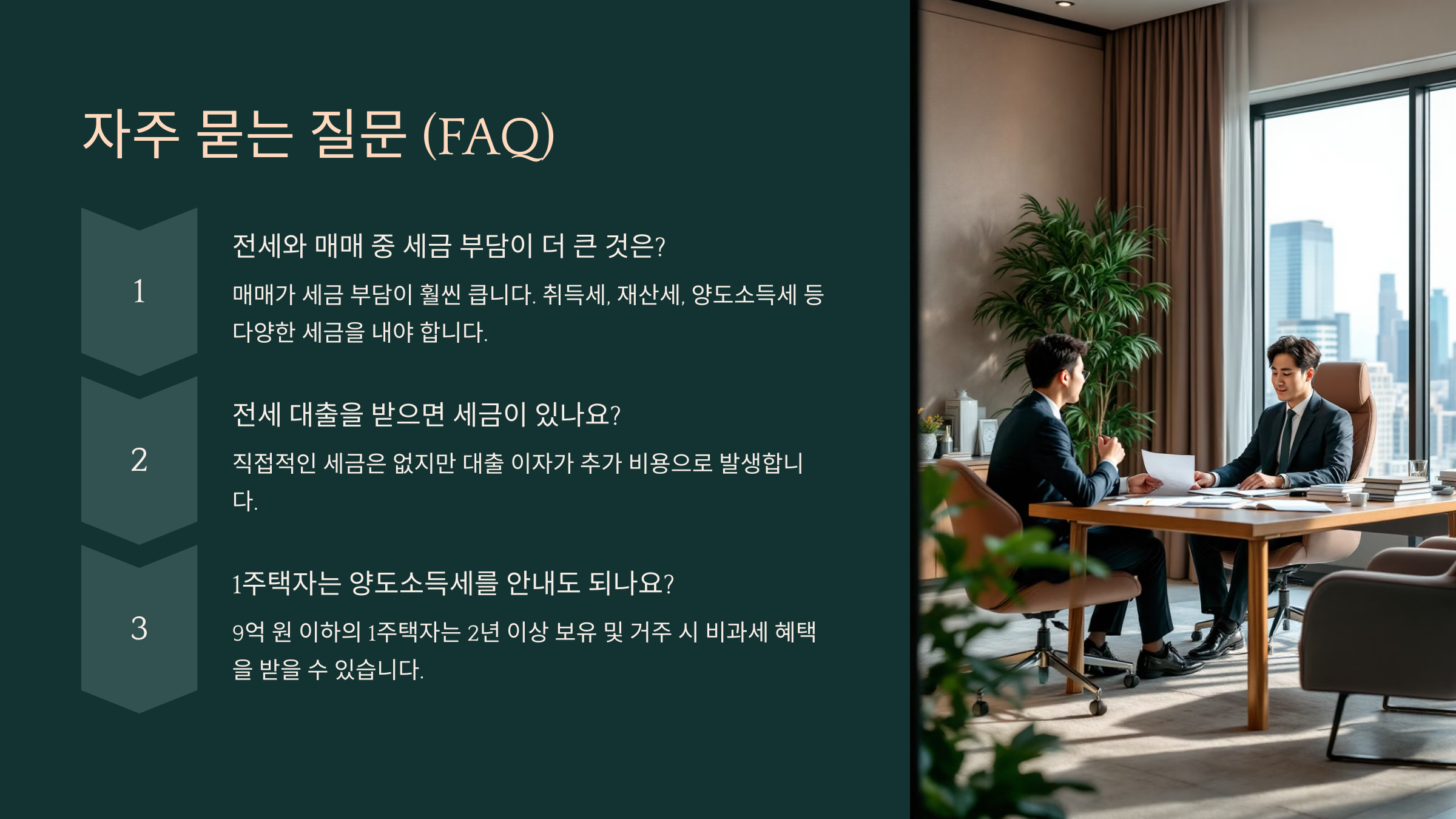 전세는 기본적으로 임차인이 직접 내야 하는 세금이 없어요. 하지만 전세 대출을 받을 경우 대출 이자에 따른 금융비용이 발생할 수 있어요. 반면, 집을 매입하면 취득세, 보유세, 양도소득세까지 다양한 세금을 신경 써야 하죠.