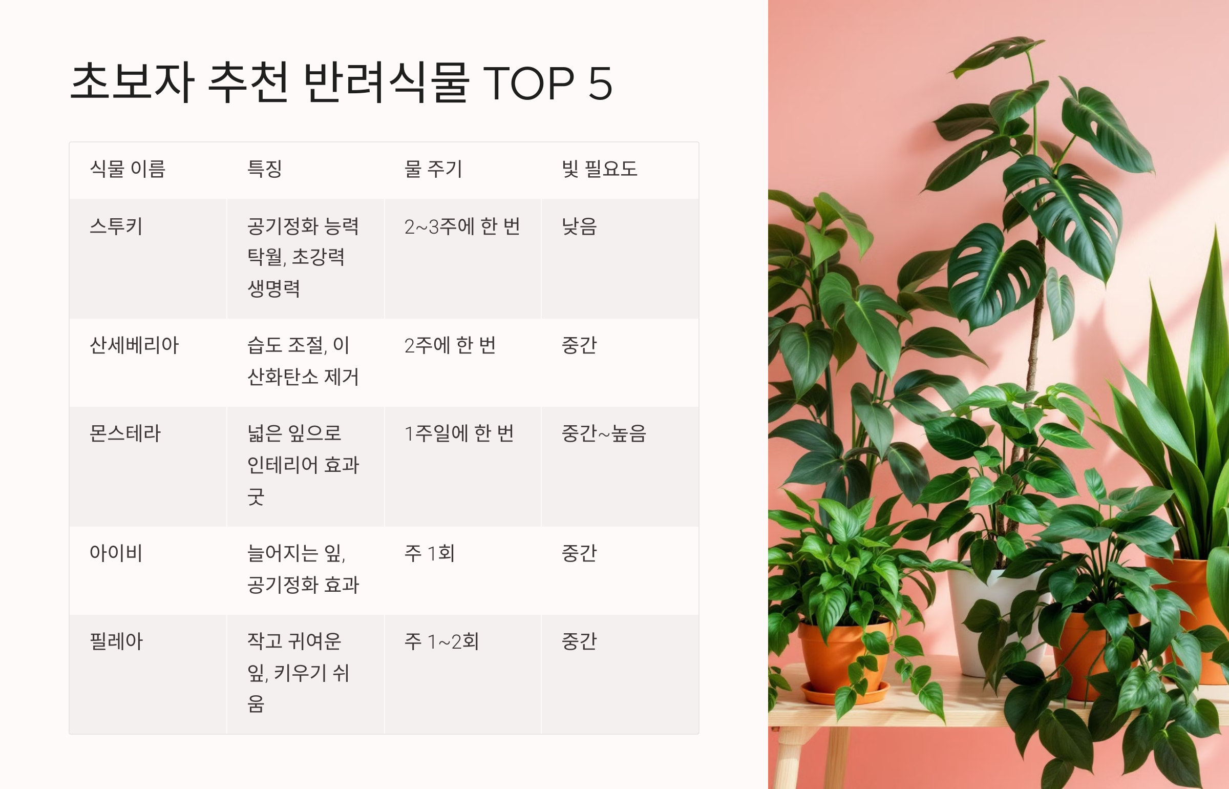 식물을 처음 키워본다면 아래 다섯 가지 식물부터 시작해보세요. 물도 많이 필요 없고, 햇빛 없어도 괜찮고, 생명력도 강해서 초보자에게 딱이에요!