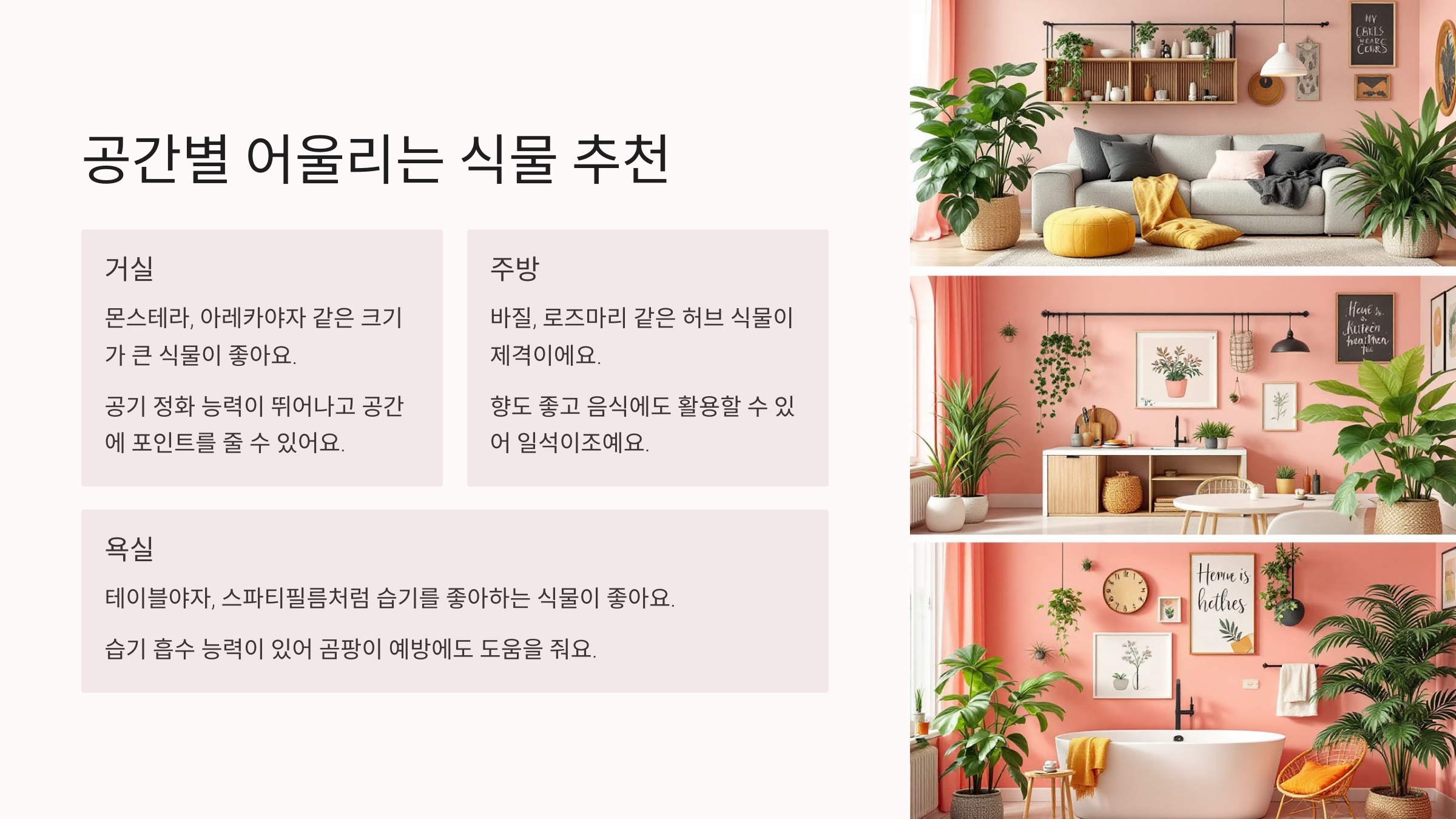 식물도 사람처럼 ‘어울리는 자리’가 있어요. 각 공간에 맞는 식물을 놓으면 분위기도 좋아지고, 식물 건강도 훨씬 좋아져요. 예를 들어 햇빛이 잘 드는 창가에는 빛을 좋아하는 식물을, 습한 욕실에는 습도에 강한 식물을 놓아주는 식이에요.