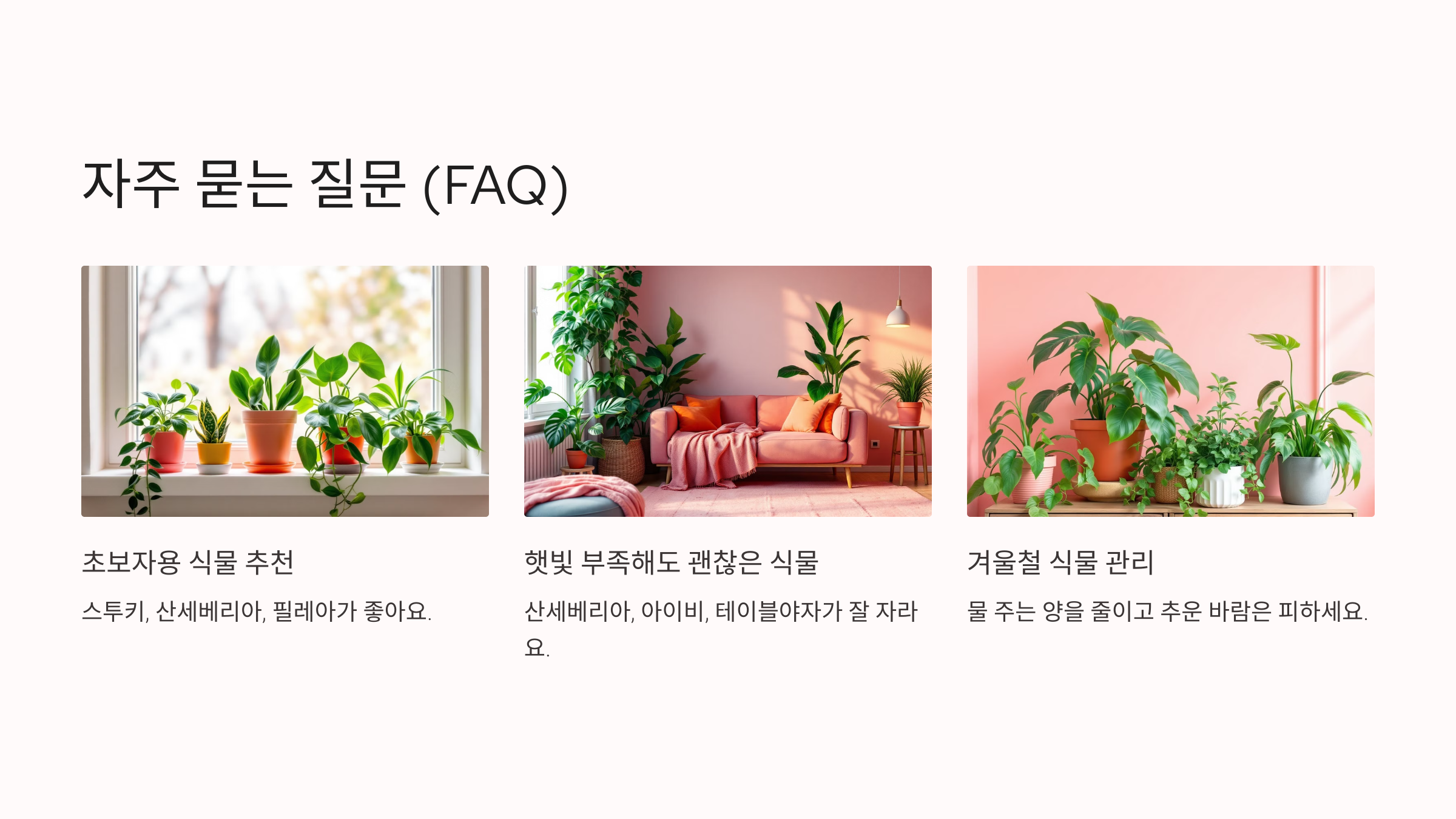 A1. 스투키, 산세베리아, 필레아처럼 물 주는 주기가 길고, 병충해에 강한 식물부터 시작하면 실패 없이 키울 수 있어요.