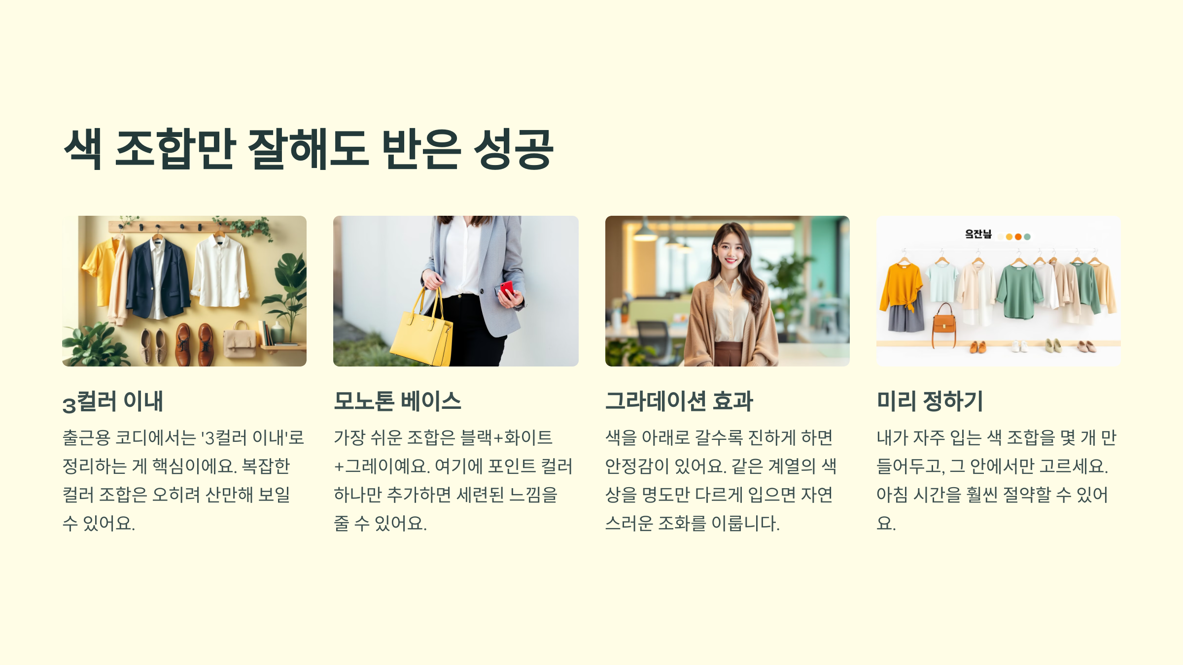 색만 잘 맞춰도 “오 오늘 좀 센스 있는데?”라는 말 들을 수 있어요! 출근용 코디에서는 ‘3컬러 이내’로 정리하는 게 핵심이에요. 톤이 다른 색들이 많으면 정신없고, 단정한 느낌이 줄어들 수 있어요.