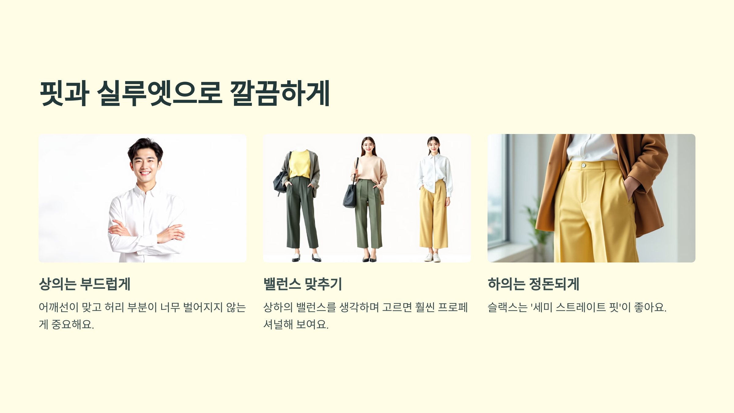 전체적인 실루엣은 “상의는 부드럽게, 하의는 정돈되게”가 핵심이에요. 위에 힘이 들어가면 부담스럽고, 아래가 너무 펑퍼짐하면 정리가 안 된 느낌을 줘요. 상하의 밸런스를 생각하며 고르면 훨씬 프로페셔널해 보여요.
