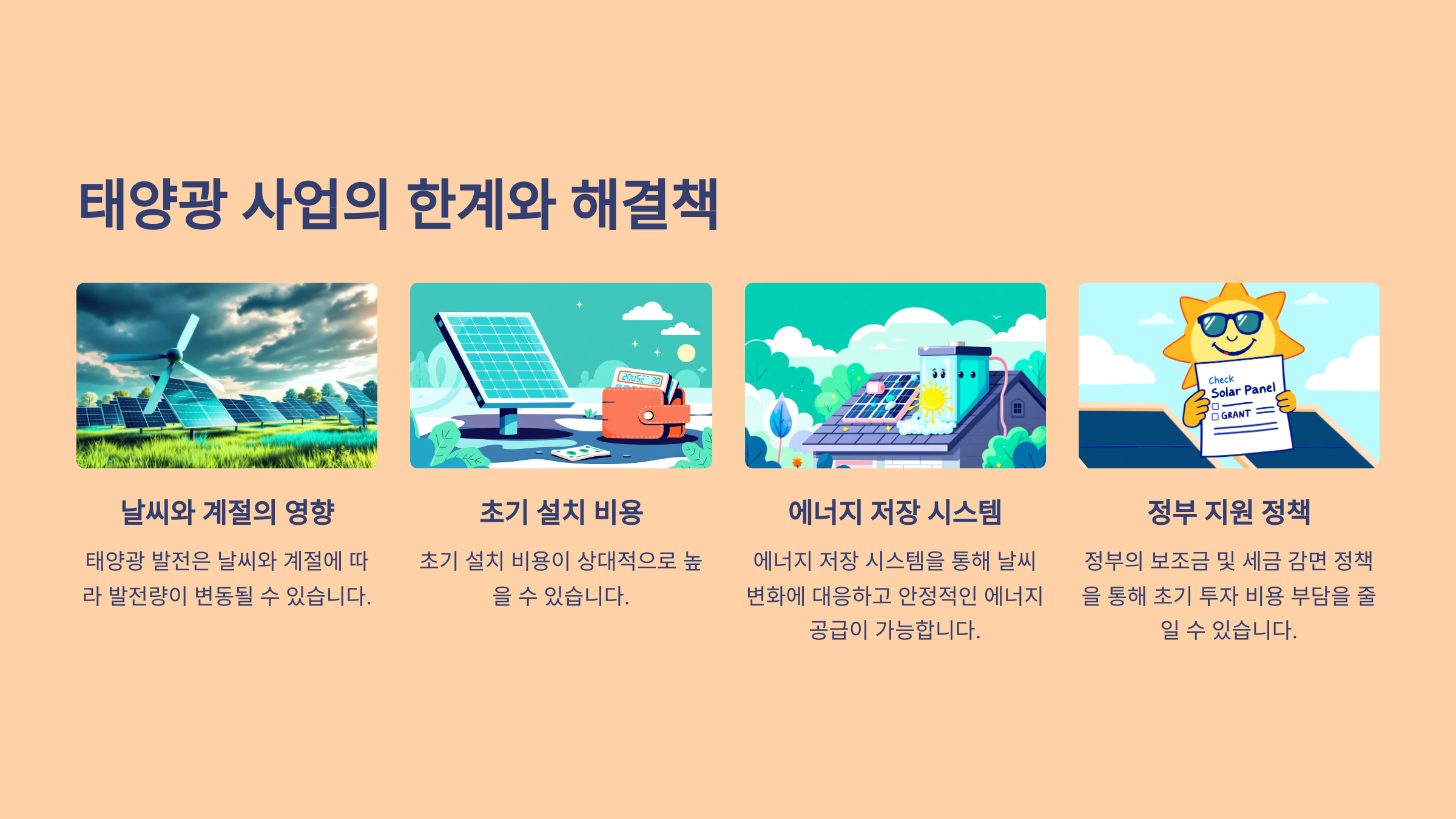 태양광 사업이 많은 장점을 가지고 있지만, 한계도 분명히 존재해요. 우선, 태양광 발전은 날씨와 계절의 영향을 많이 받아요. 흐린 날이나 밤에는 에너지를 생산하지 못하기 때문에 에너지 저장 시스템이 필수적이에요.
