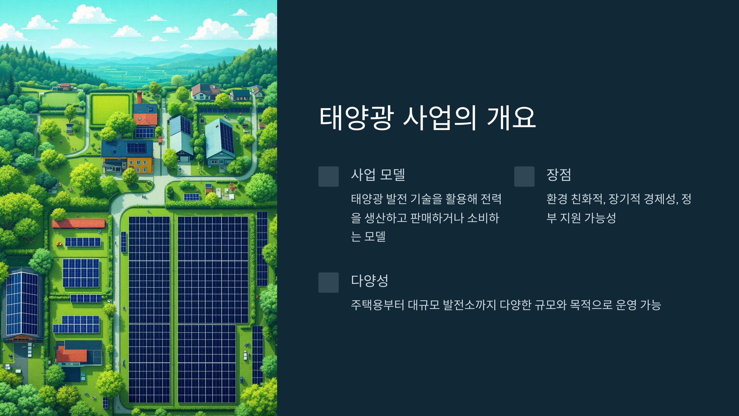 태양광 사업은 주택, 상업용 건물, 대규모 태양광 발전소 등 다양한 형태로 운영될 수 있어요. 작은 규모의 주택용 설치부터, 수백 메가와트(MW)급 대규모 발전소까지 규모와 목적에 따라 다양한 사업 모델을 선택할 수 있다는 것도 큰 장점이에요.