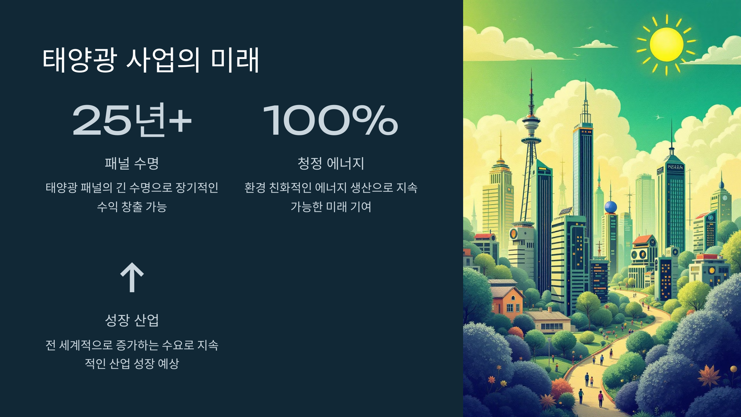 태양광 에너지는 무한한 자원을 활용하기 때문에 환경에 부담을 주지 않아요. 또한 설치 후 운영 비용이 적게 들어 장기적으로 경제적인 장점을 가질 수 있어요. 게다가, 정부의 재생에너지 보조금이나 세제 혜택을 받을 수 있는 기회도 많기 때문에 태양광 사업은 점점 더 매력적인 옵션이 되고 있답니다.