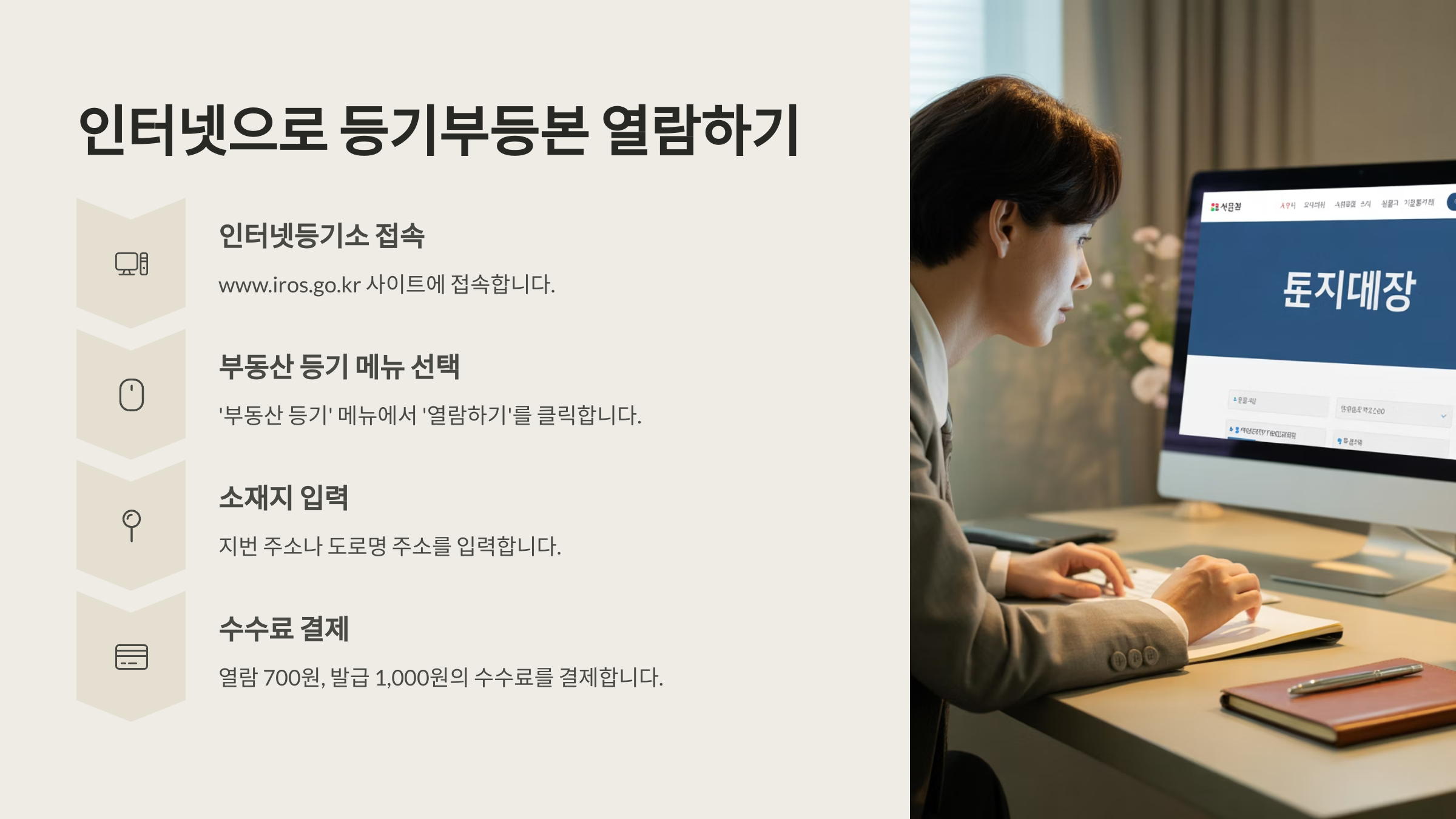 대법원에서 운영하는 **인터넷등기소(www.iros.go.kr)**를 통해 누구나 손쉽게 등기부등본을 열람하거나 발급할 수 있습니다. 회원가입 없이도 사용 가능하며, 수수료는 열람 700원, 발급 1,000원입니다.