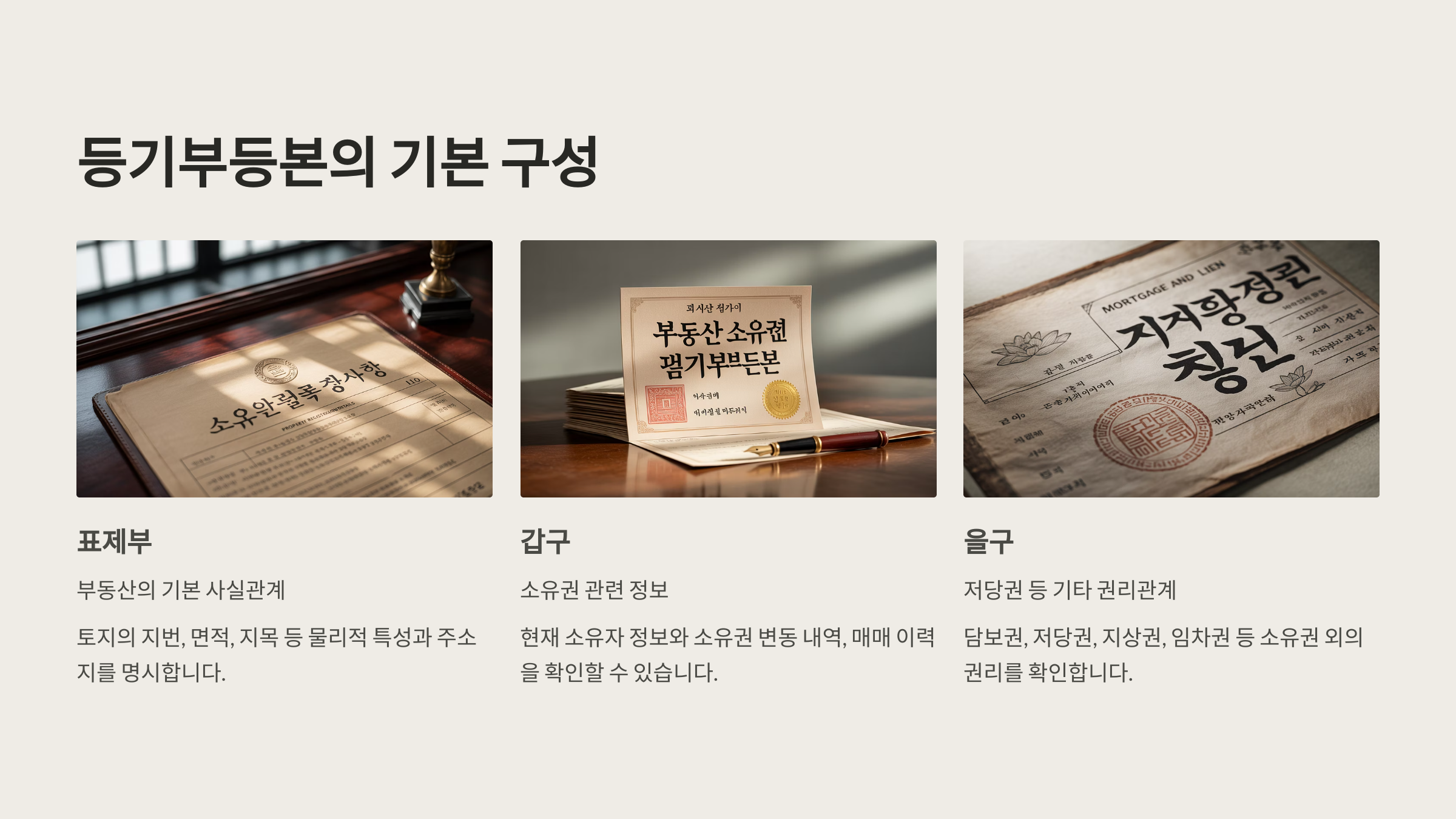 등기부등본은 크게 표제부, 갑구, 을구로 나뉘며, 각 항목은 서로 다른 성격의 정보를 담고 있습니다.