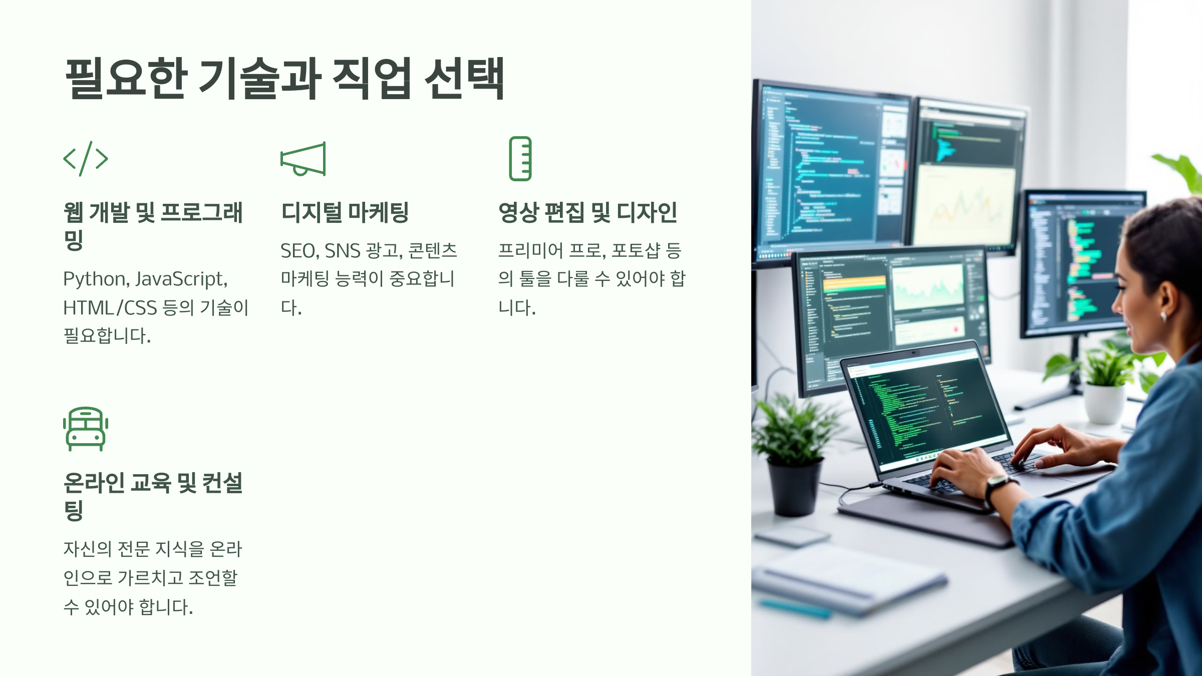 처음에는 안정적인 원격 근무나 프리랜서로 시작한 후, 점차 온라인 강의나 이커머스 같은 확장 가능한 모델로 발전시키는 것이 좋아요.