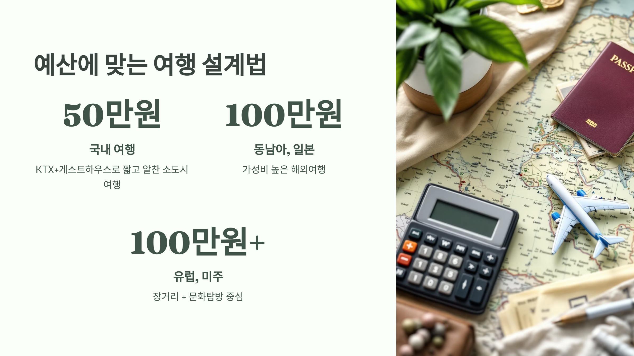 예산을 3단계로 나눠 여행 스타일별로 추천드릴게요. 내 상황에 맞는 범위에서 즐거운 여행을 만들어보세요 🧳