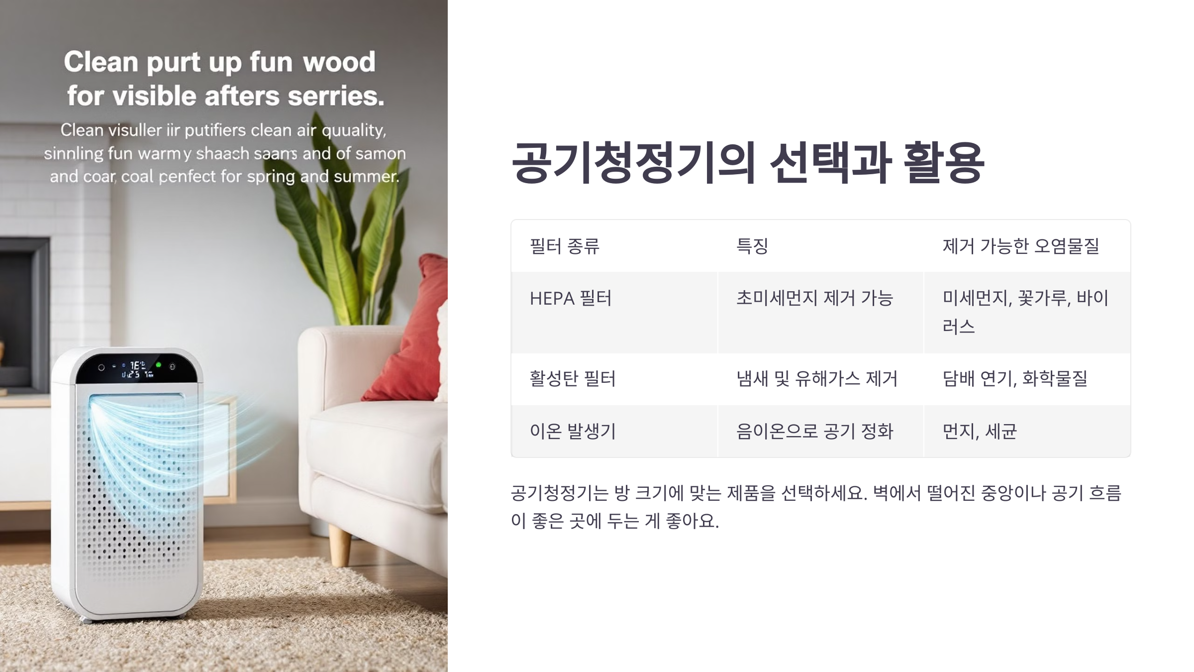 ✅ 필터 종류 확인: 공기청정기의 핵심은 필터예요. HEPA 필터는 초미세먼지까지 걸러주고, 활성탄 필터는 냄새 제거에 효과적이에요.
