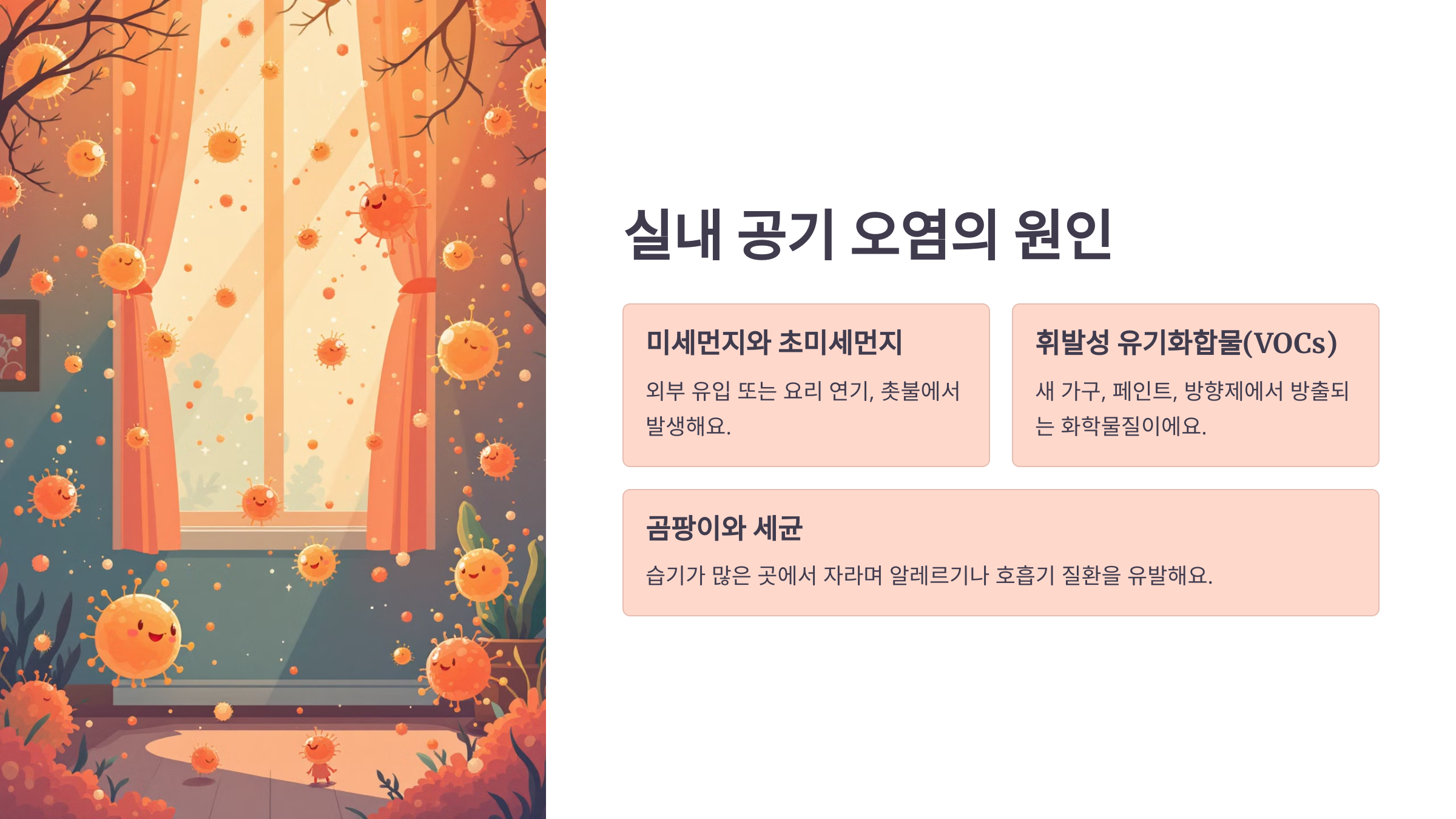 실내 공기가 나빠지는 이유는 다양해요. 우리가 숨 쉬는 공기 속에는 눈에 보이지 않는 미세먼지와 유해물질이 포함되어 있죠. 그중에서도 주요 오염원은 다음과 같아요.