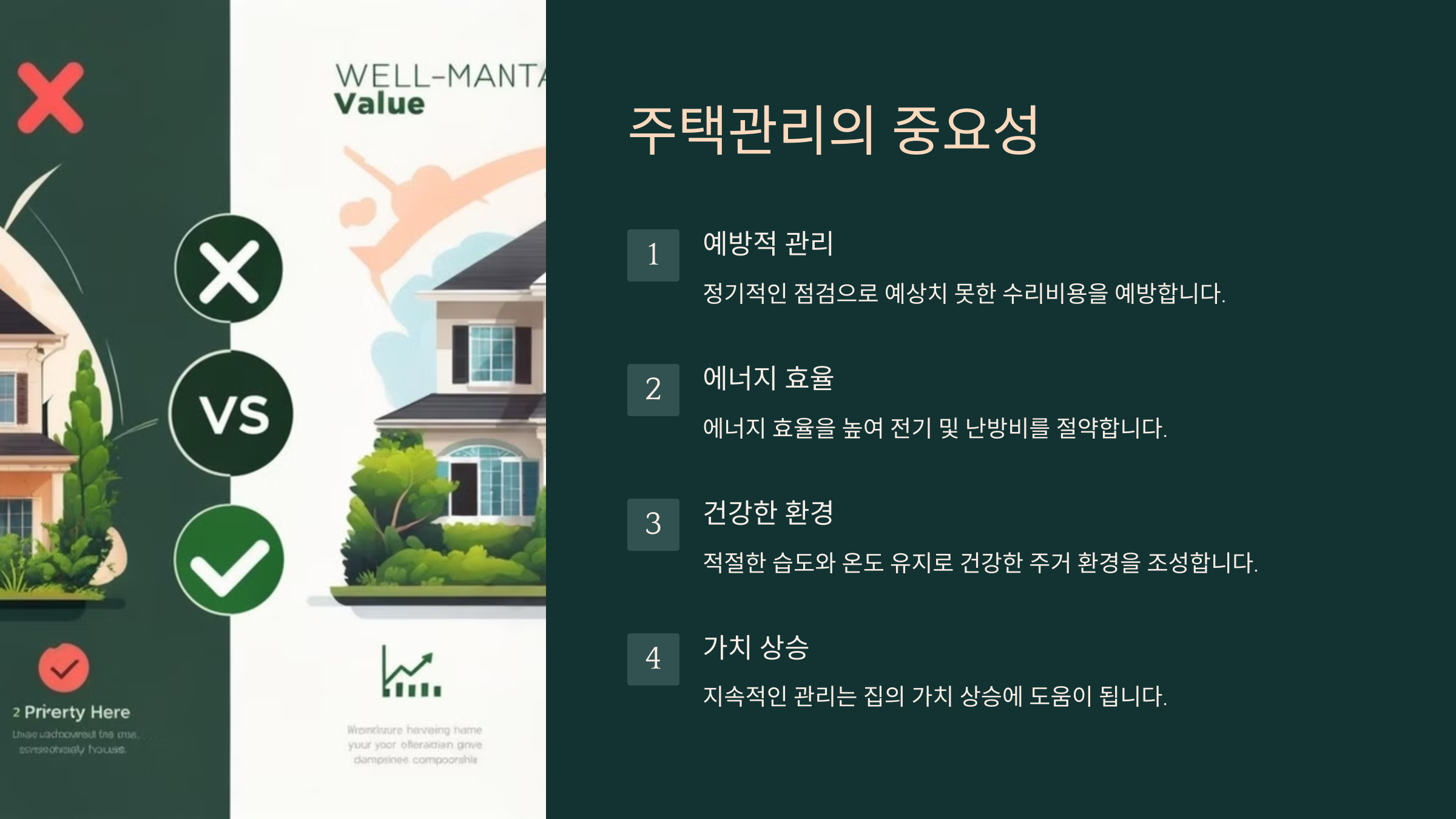 주택관리는 주거 환경의 쾌적함을 유지하고 비용을 절감하는 핵심입니다.
