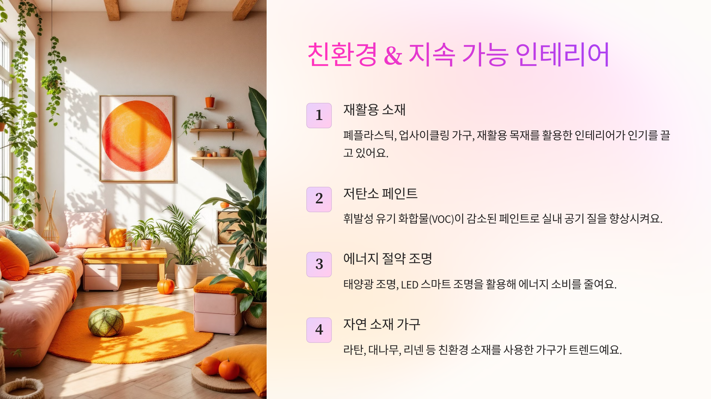 환경 보호와 지속 가능성을 고려한 인테리어가 점점 더 중요해지고 있어요. 🌍