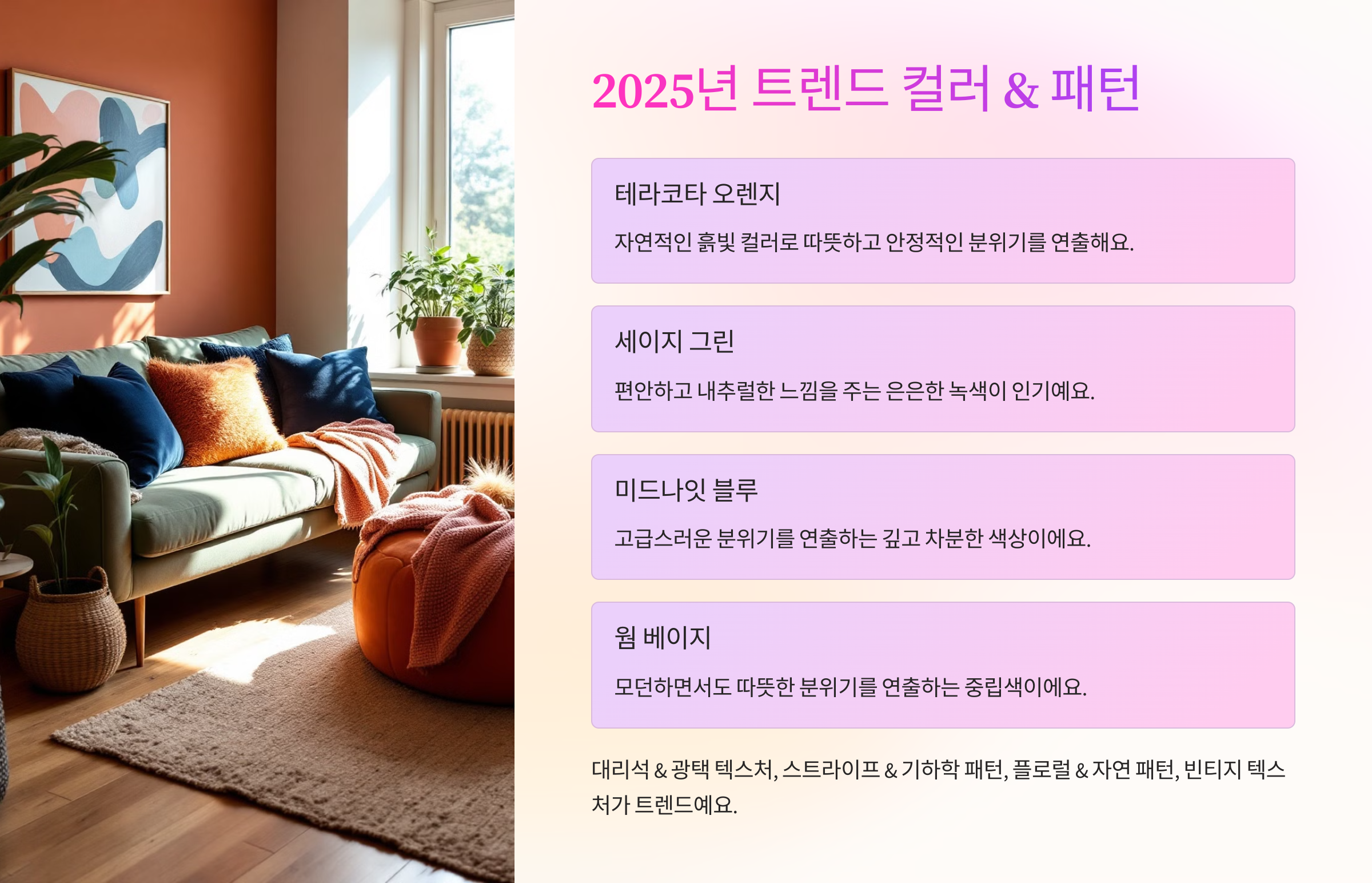 2025년 인테리어 트렌드는 자연에서 영감을 받은 컬러와 대담한 패턴이 중심이 될 전망이에요. 색상과 패턴을 활용하면 공간의 분위기를 완전히 바꿀 수 있어요. 🏡✨
